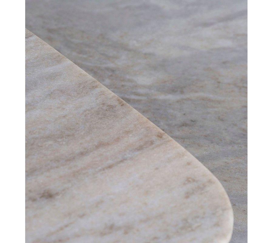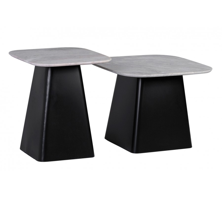Stolíky majú modernú siluetu, v ktorej prevládajú rovné línie. Rohy vrchnej dosky a vertikálne hrany podstavy sú mierne zaoblené, čo im dodáva elegantný vzhľad. Vrchné dosky majú štvorcový tvar a sú vyrobené zo sivého mramoru. Vrchnú dosku zdobí jemná prírodná kresba kameňa. Vďaka tomuto exkluzívnemu materiálu pôsobia stolíky luxusným dojmom.