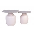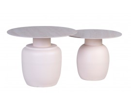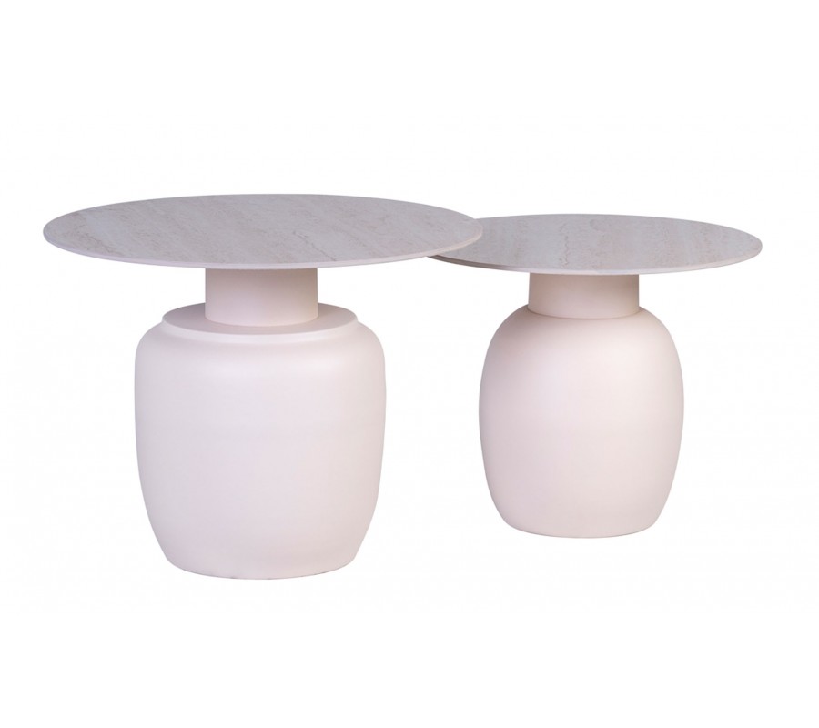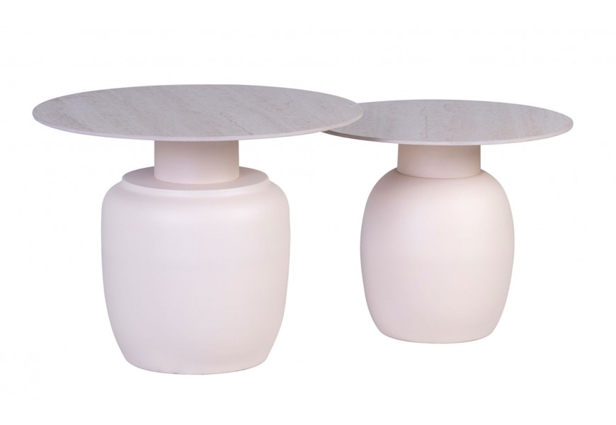 Vrchné dosky majú jednoduchý okrúhly tvar a zdobí ich subtílna mramorová kresba v jemných béžových odtieňoch. Podstava má bielu farbu a svojím tvarom pripomína vázu. Jej hladký povrch výborne dopĺňa vrchnú dosku a nábytok tak pôsobí moderným dojmom.