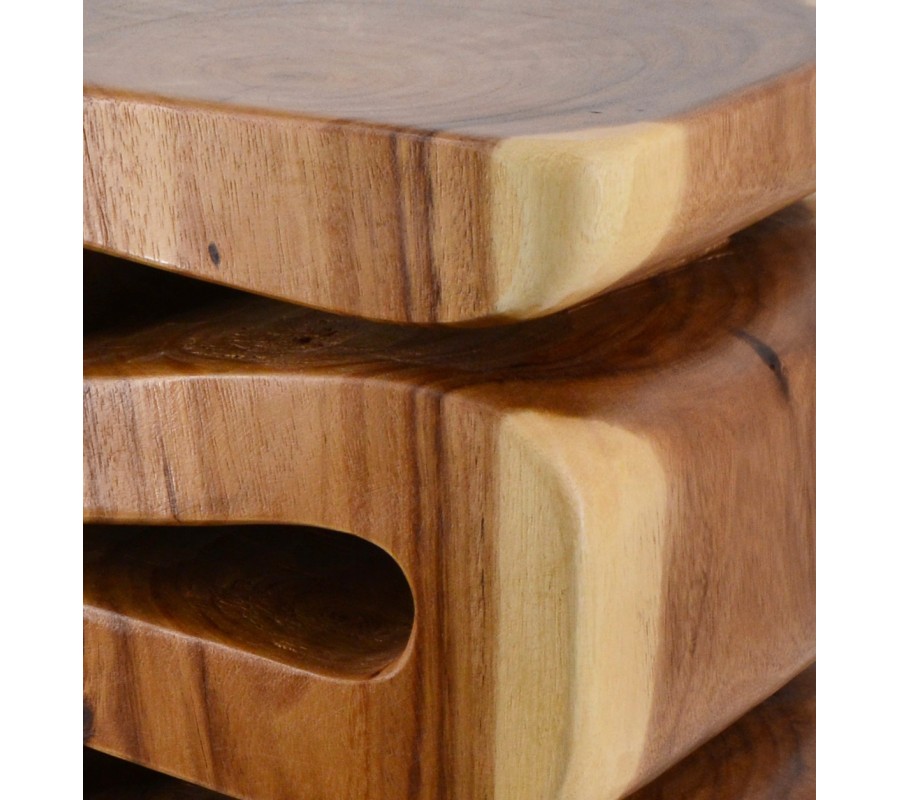 Stolík je vyrobený z masívneho dreva suar. Ide o exotickú drevinu, ktorá je vyhľadávaná najmä vďaka výraznej kresbe dreva v teplých hnedých odtieňoch. Takisto ide o mimoriadne tvrdý materiál, ktorý vám zaručí výbornú odolnosť a trvanlivosť nábytku.