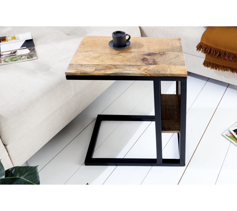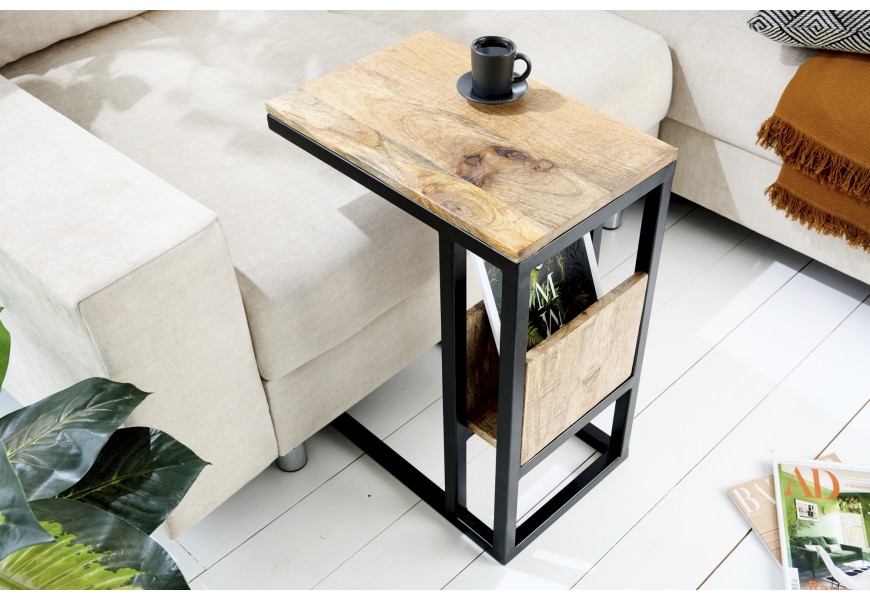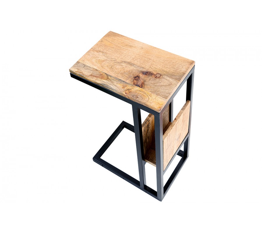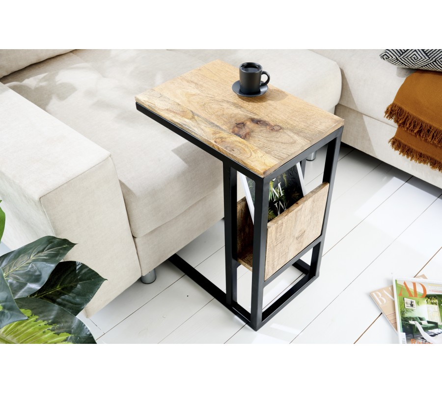 Príručný stolík Lana v sebe spája moderný dizajn s industriálnym nádychom a krásu prírodného dreva. Oceníte aj integrovaný držiak na časopisy a praktickú možnosť čiastočného zasunutia pod kreslo či sedačku.