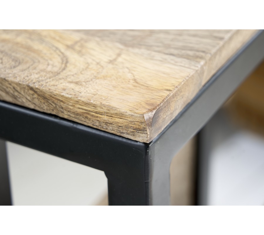 Vrchná doska a steny police sú vyrobené z mangového dreva. Tento materiál prináša do industriálneho dizajnu prírodný prvok. Na hladkých povrchoch je viditeľná štruktúra letokruhov v príjemných svetlých hnedých odtieňoch.
