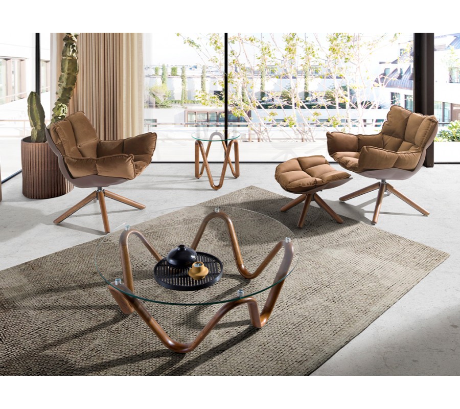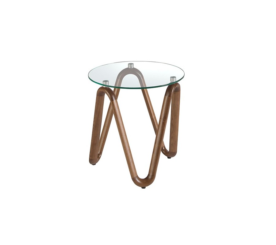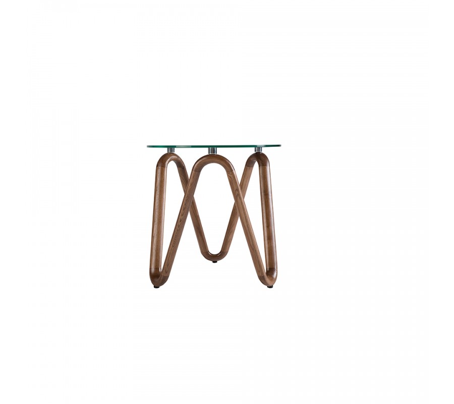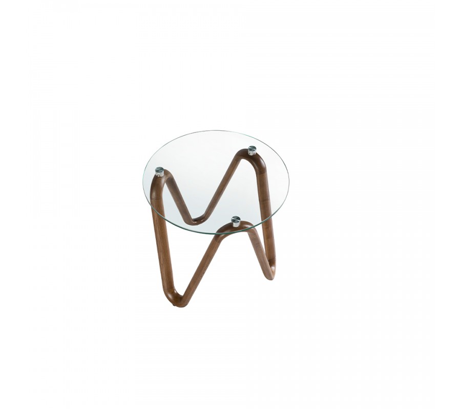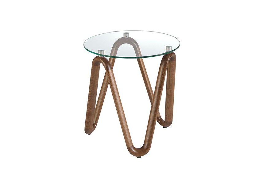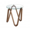 Luxusný dizajnový okrúhly príručný stolík Forma Moderna so zvlnenou drevenou hnedou podstavou a sklenenou doskou 50 cm