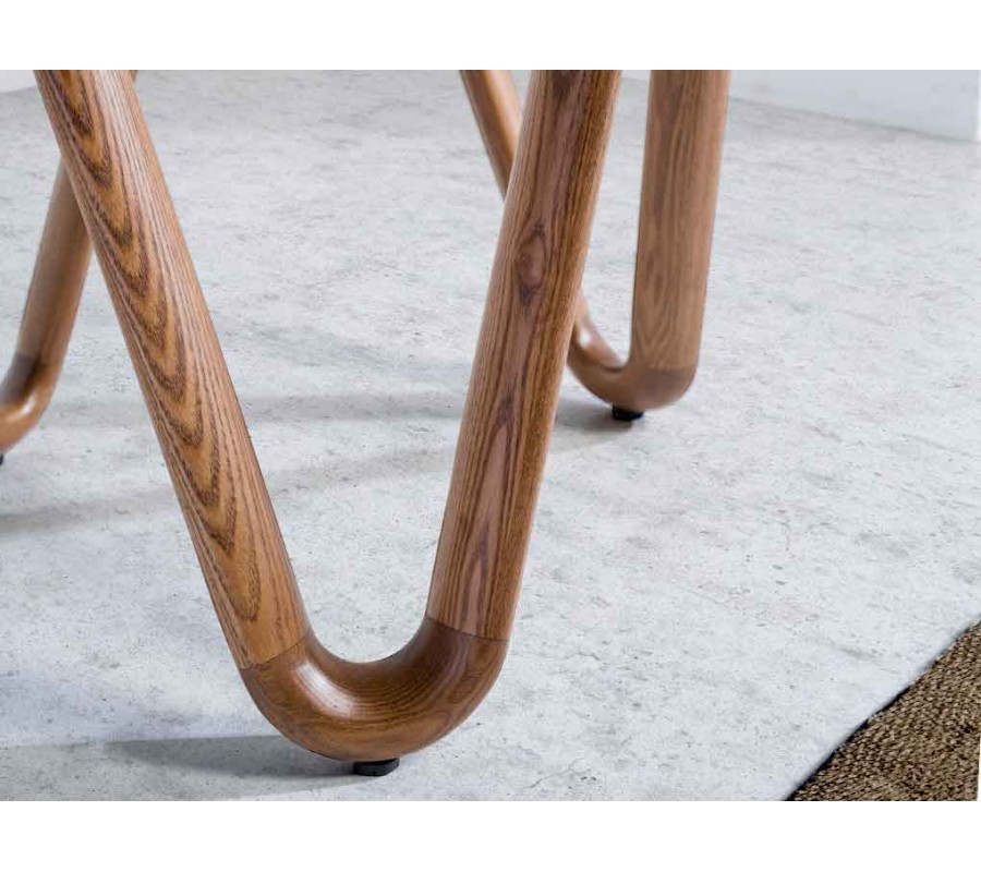 Plynulý tvar výborne dopĺňa drevo v krásnom orechovom hnedom odtieni. Na hladkých valcovitých povrchoch podstavy je viditeľná jemná kresba letokruhov, čo prináša do striktne moderného dizajnu príjemný naturálny prvok a pocit harmónie.