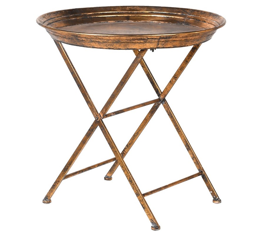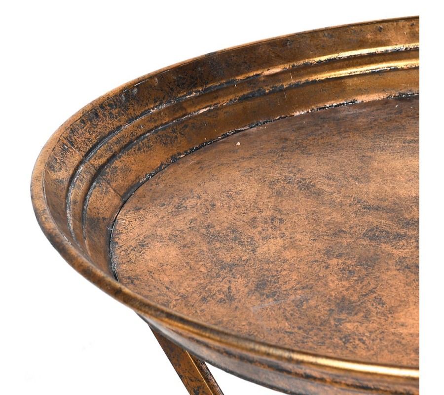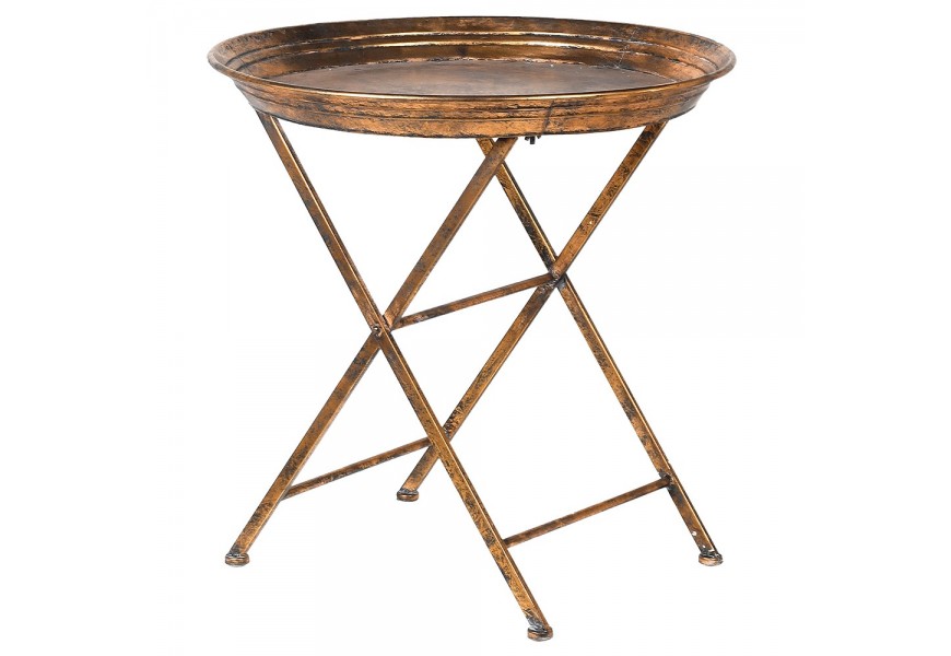 Dizajnový vintage príručný stolík Enochio s vrchnou doskou v tvare okrúhleho podnosu v zlatej farbe s patinou 66 cm