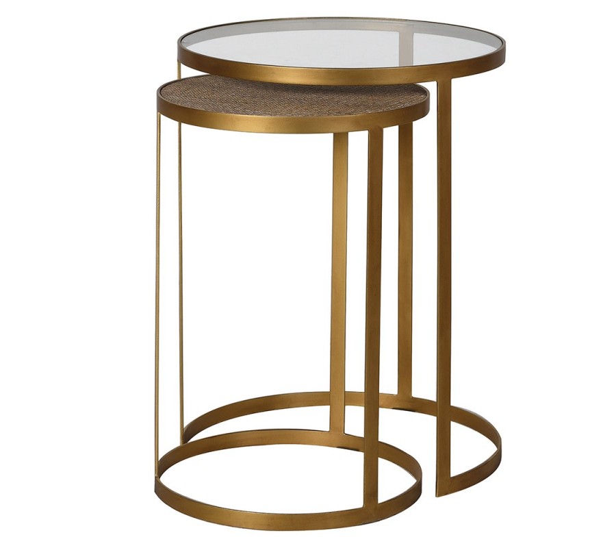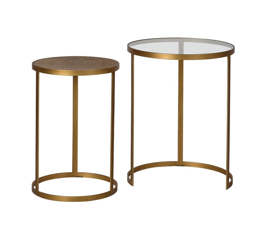 Konštrukcia stolíkov je vyrobená z kovu s náterom v žiarivej zlatej farbe. V kombinácii so striktnými geometrickými tvarmi tak nábytok pôsobí luxusným art deco dojmom. Vrchná doska vyššieho stolíka je vyrobená z priehľadného bezpečnostného skla, ktoré vám poskytuje pevný a odolný povrch. Nižší stolík má zasa vrchnú dosku vyrobenú z elegantného ratanového výpletu v naturálnej hnedej farbe. Do dizajnu prináša zaujímavú štruktúru, ktorá je v kontraste s hladkými povrchmi kovu a skla.
