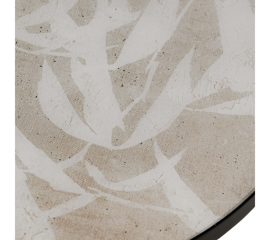Farebná schéma stolíka pôsobí neutrálne a vyvážene. Vrchná doska spája tóny béžovej a bielej, zatiaľ čo podstava kontrastuje matnou čiernou farbou. Dekoratívny vzor bambusových lístkov v bielej farbe na doske slúži ako výrazný dizajnový akcent, ktorý stolíku prepožičiava jemný umelecký nádych.