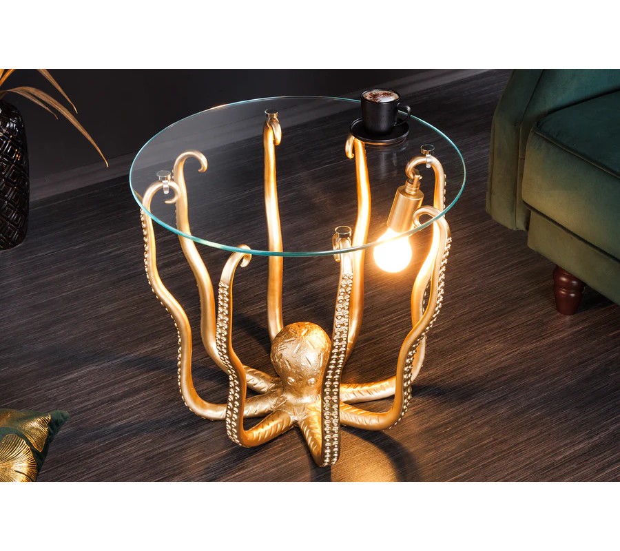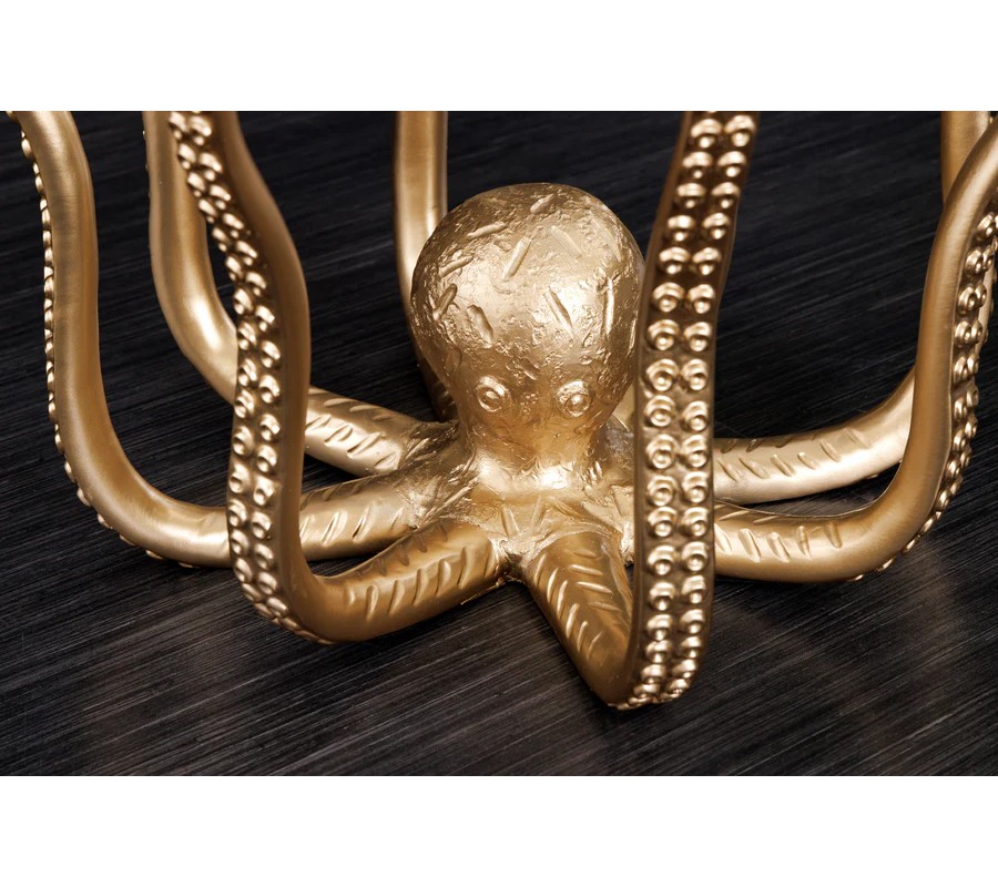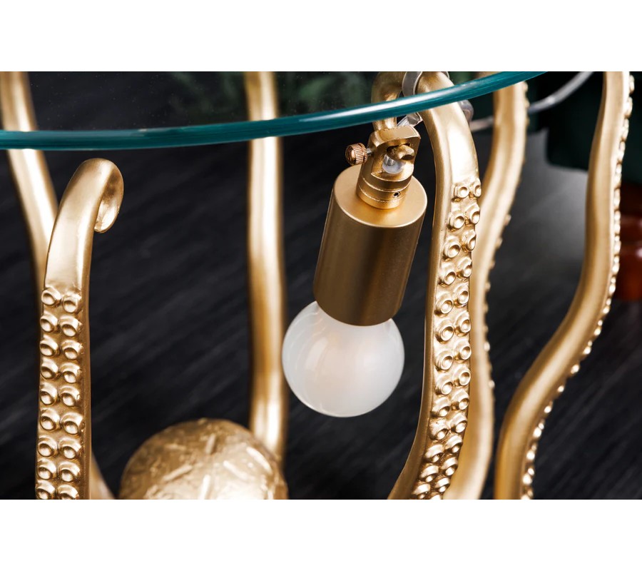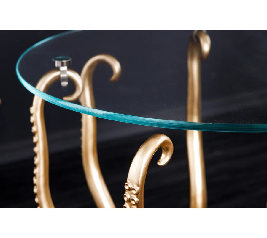 Príručný stolík má okrúhlu sklenenú dosku, ktorá dodáva celkovému dizajnu ľahkosť a vzdušnosť. Noha stolíka je vytvorená v podobe zlatej chobotnice s detailne vypracovanými chápadlami, ktoré vytvárajú zaujímavú a výraznú nohu. Doska je pevne uchytená pomocou jemných kovových úchytov, ktoré zabezpečujú stabilitu a zároveň neprekrývajú elegantný vzhľad.