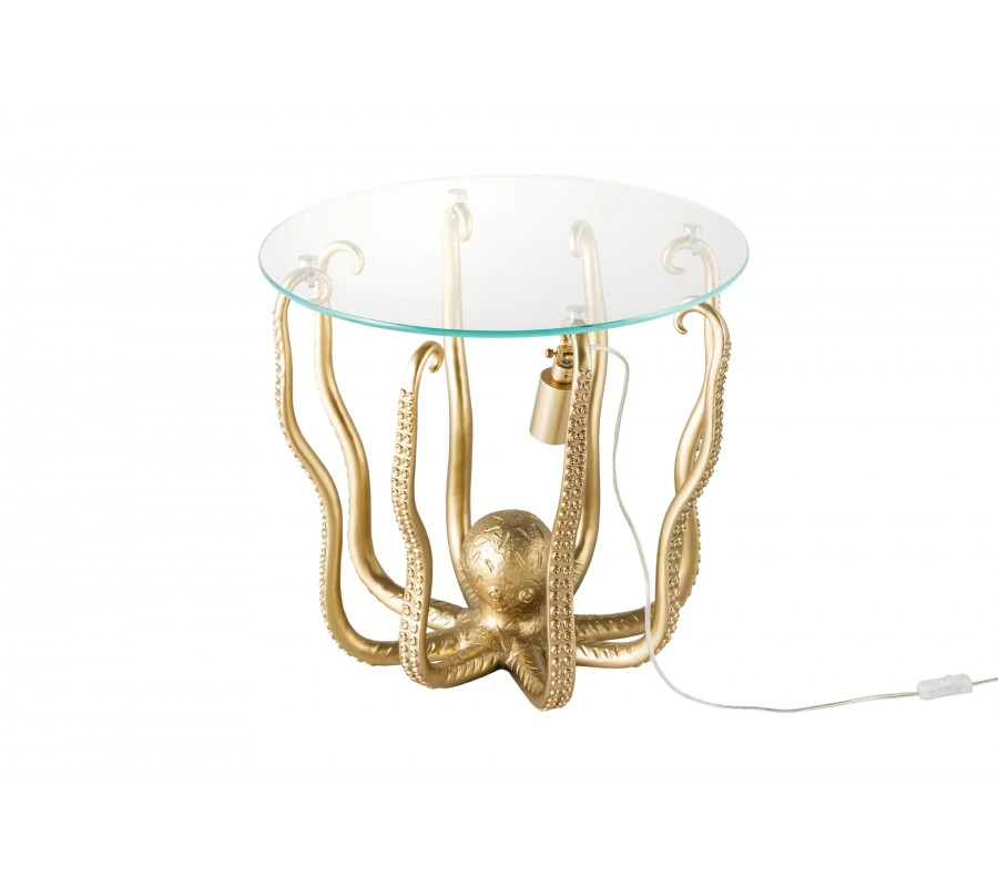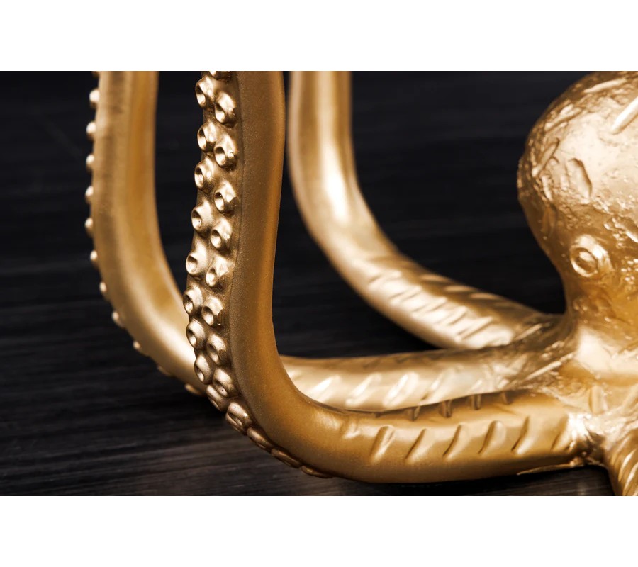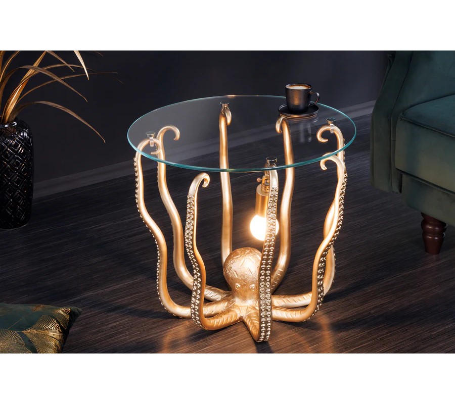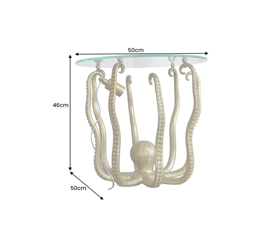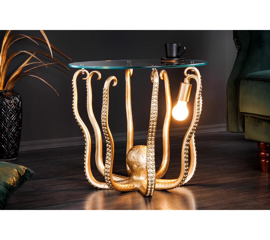 Príručný stolík má okrúhlu sklenenú dosku, ktorá dodáva celkovému dizajnu ľahkosť a vzdušnosť. Noha stolíka je vytvorená v podobe zlatej chobotnice s detailne vypracovanými chápadlami, ktoré vytvárajú zaujímavú a výraznú nohu. Doska je pevne uchytená pomocou jemných kovových úchytov, ktoré zabezpečujú stabilitu a zároveň neprekrývajú elegantný vzhľad.