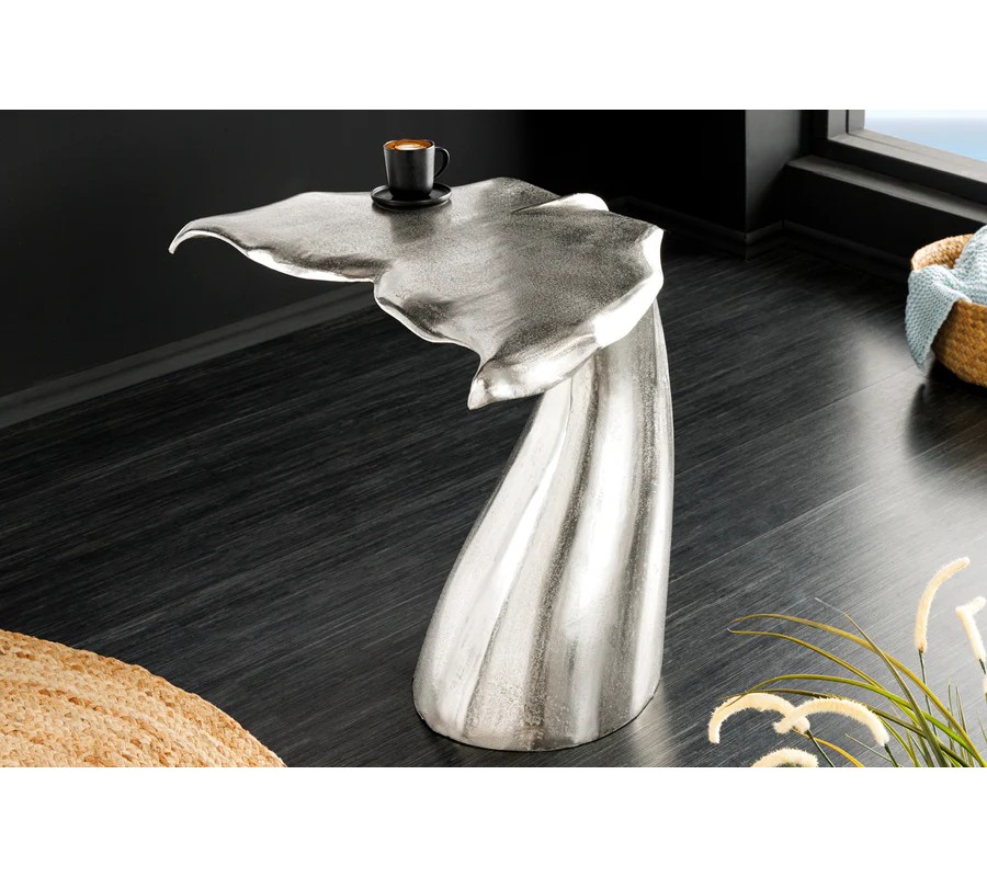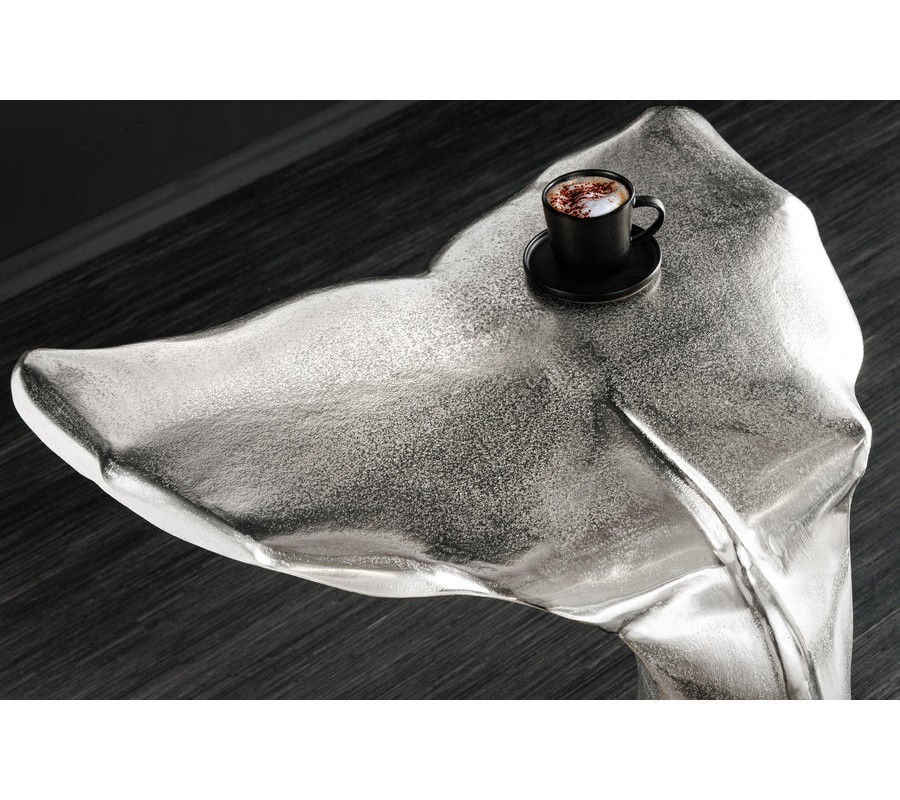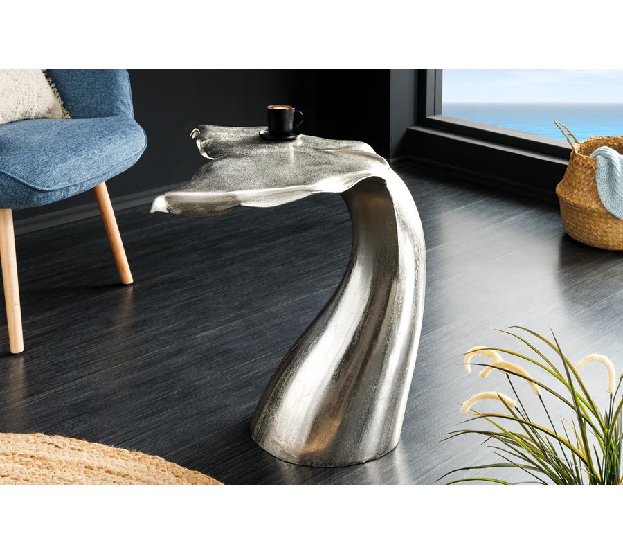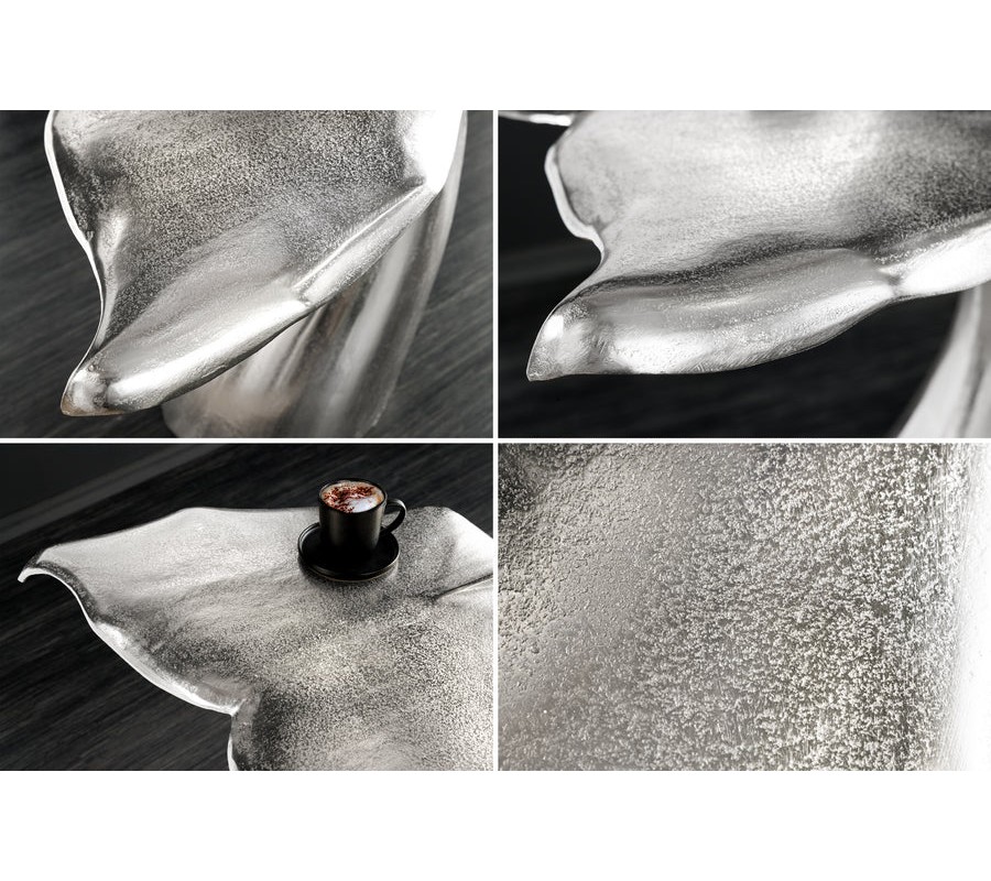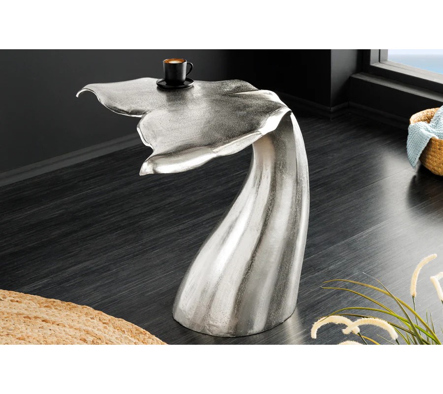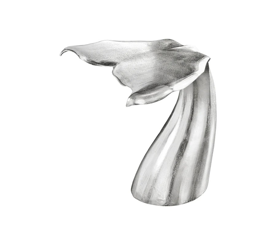 Farba stolíka je strieborná, s jemne lesklým povrchom, ktorý zvýrazňuje detaily tvaru a pridáva mu sofistikovaný vzhľad. Povrch je hladký, s jemnými textúrami, ktoré pripomínajú štruktúru veľrybieho chvosta.