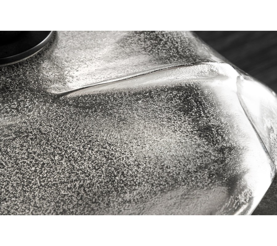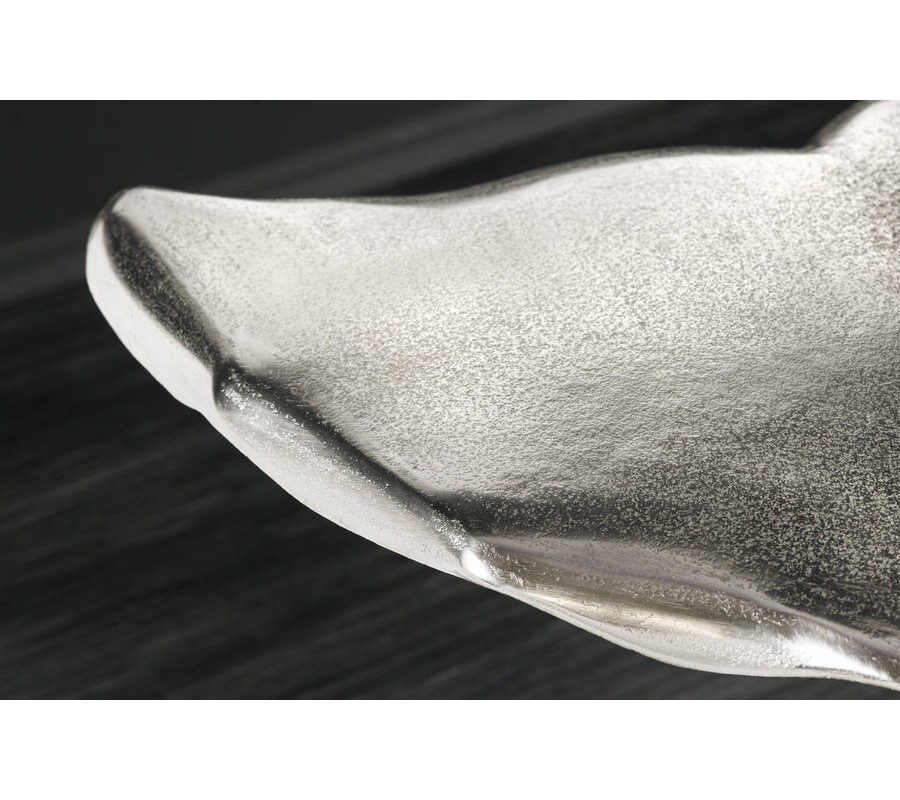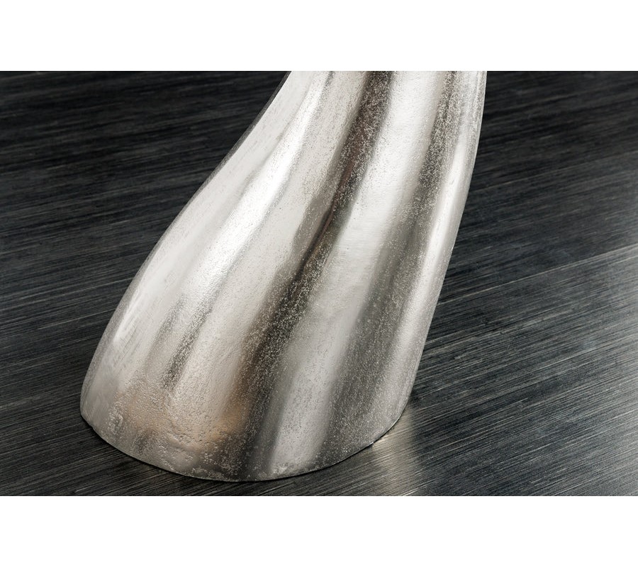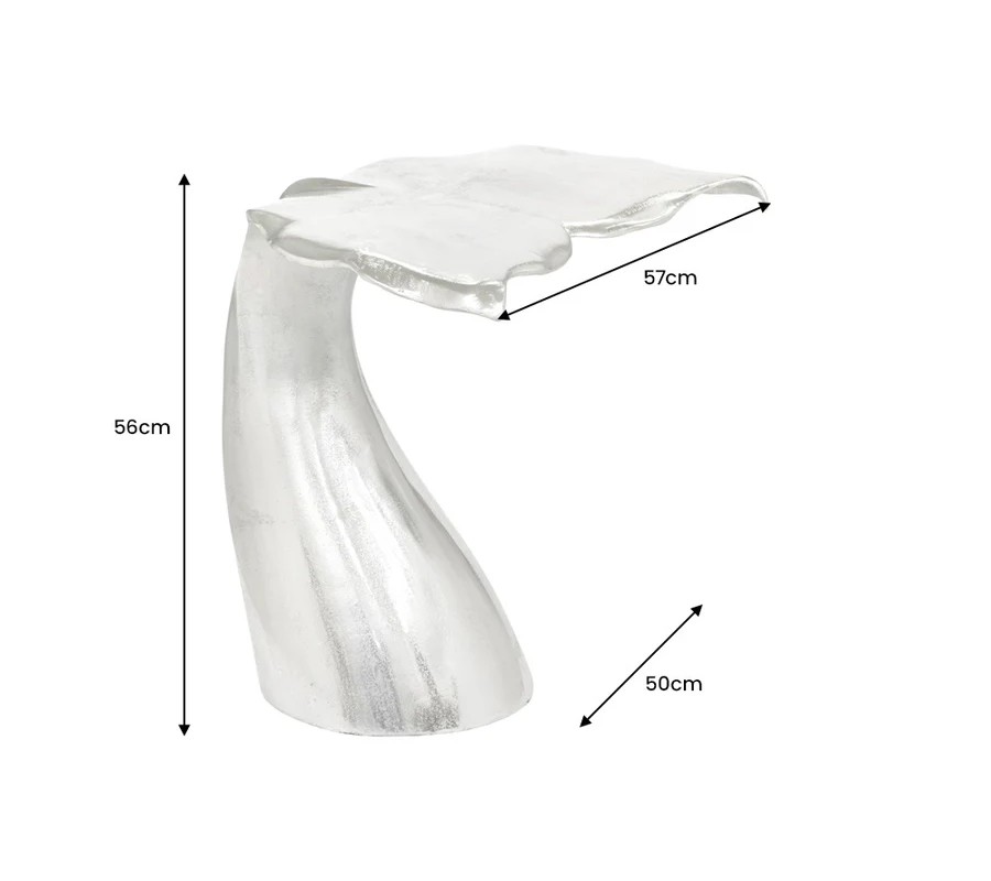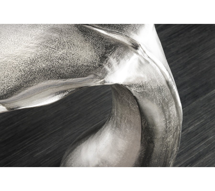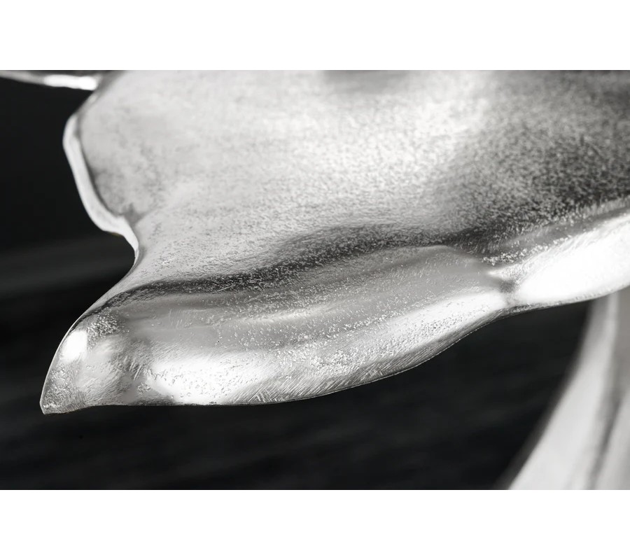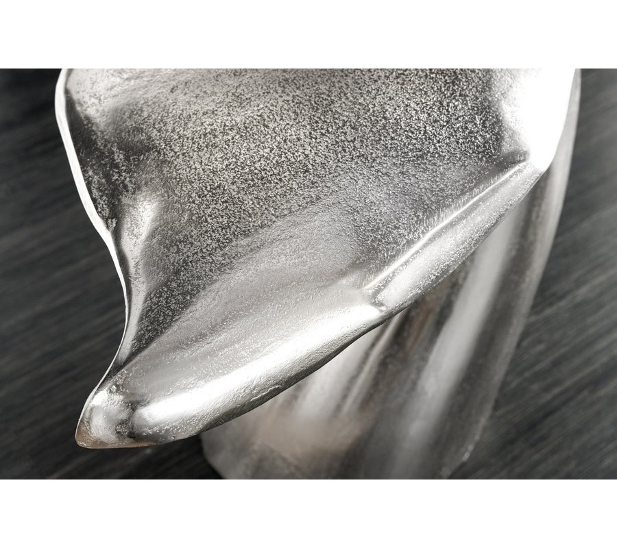 Farba stolíka je strieborná, s jemne lesklým povrchom, ktorý zvýrazňuje detaily tvaru a pridáva mu sofistikovaný vzhľad. Povrch je hladký, s jemnými textúrami, ktoré pripomínajú štruktúru veľrybieho chvosta.