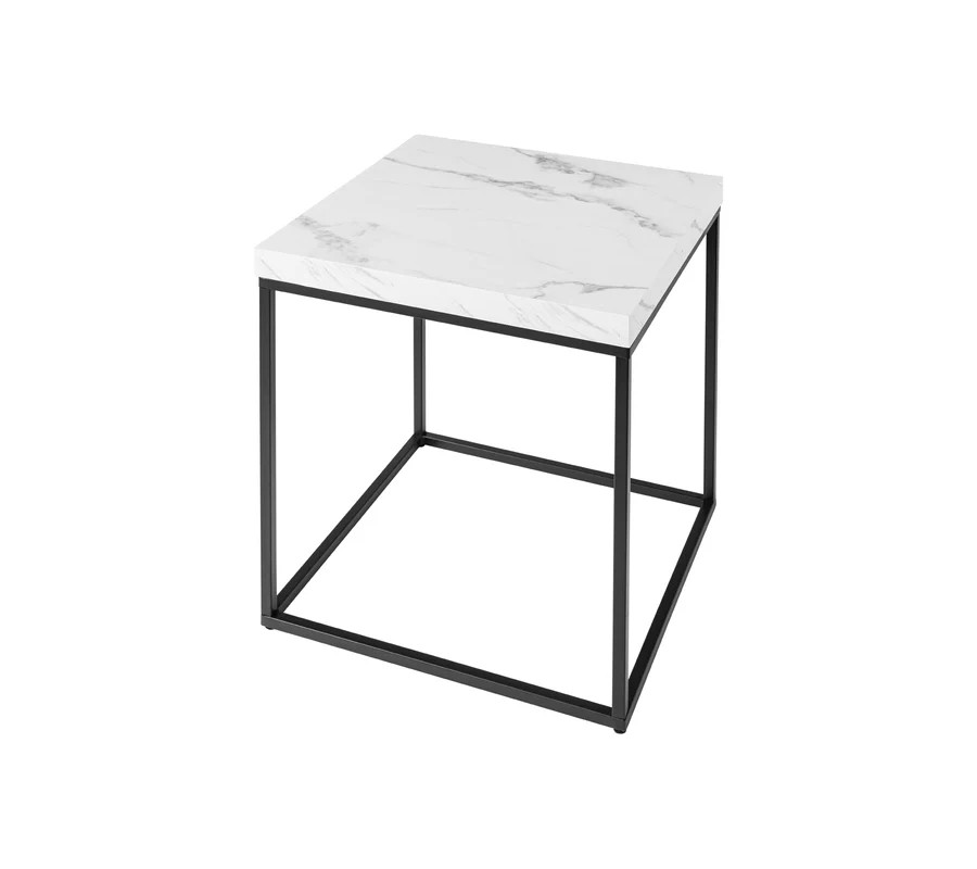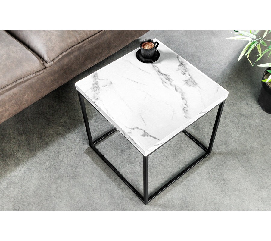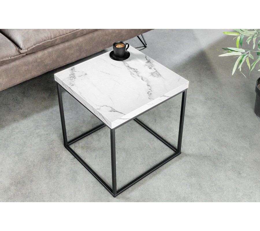 Dizajnový industriálny štvorcový príručný stolík Architect s bielym mramorovým vzorom a kovovou konštrukciou 50 cm