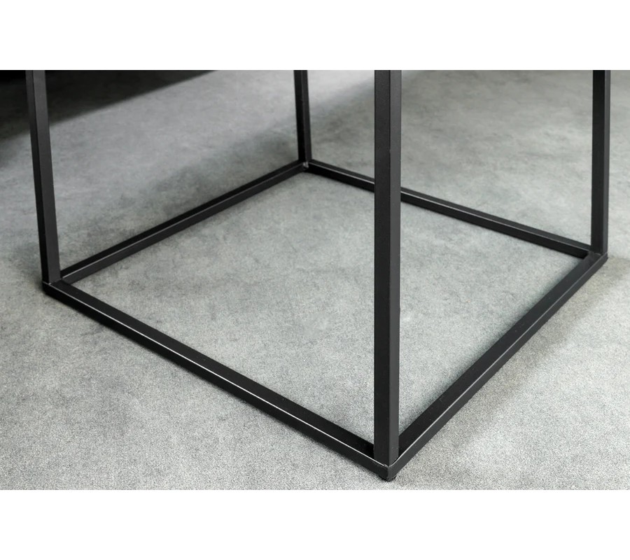 Na prvý pohľad púta pozornosť svojím jednoduchým štvorcovým tvarom a kovovou konštrukciou s matným čiernym povrchom, ktorý je typický pre industriálny dizajn. Rám pozostáva zo štyroch úzkych nôh, ktoré sú na spodnej časti prepojené štvorcovou spojnicou. Podstava poskytuje stabilitu a pevnosť, zároveň elegantne dopĺňa celkovú vizuálnu harmóniu stolíka.