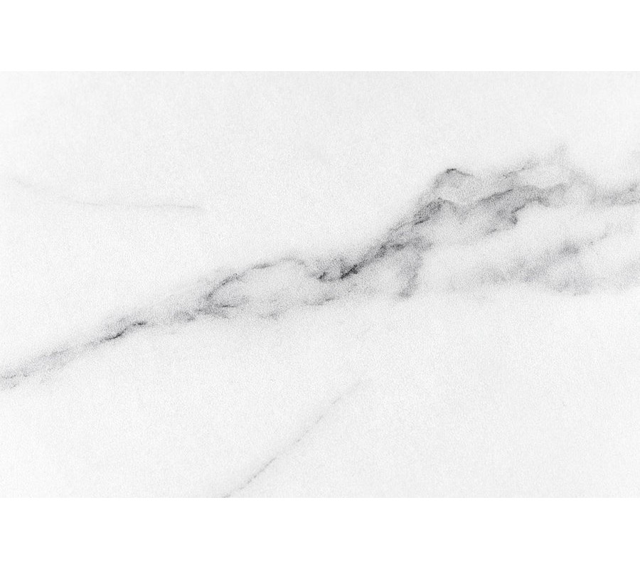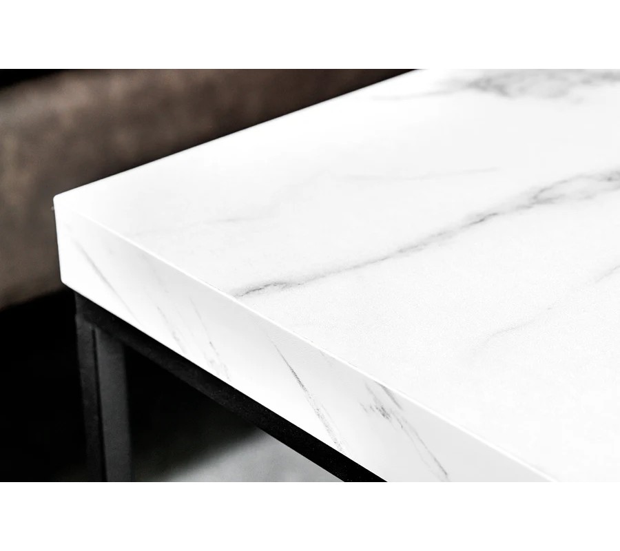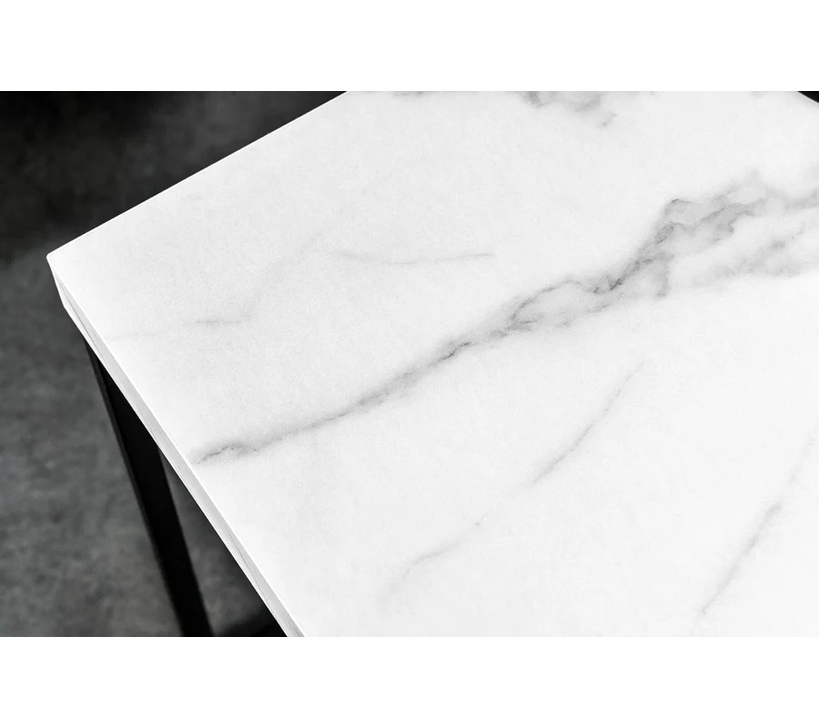Povrch vrchnej dosky je pokrytý realistickou imitáciou bieleho mramoru, čo stolíku dodáva sofistikovaný a luxusný vzhľad. Matná povrchová úprava podčiarkuje prirodzenú textúru mramoru a dokonale zapadá do industriálneho štýlu.