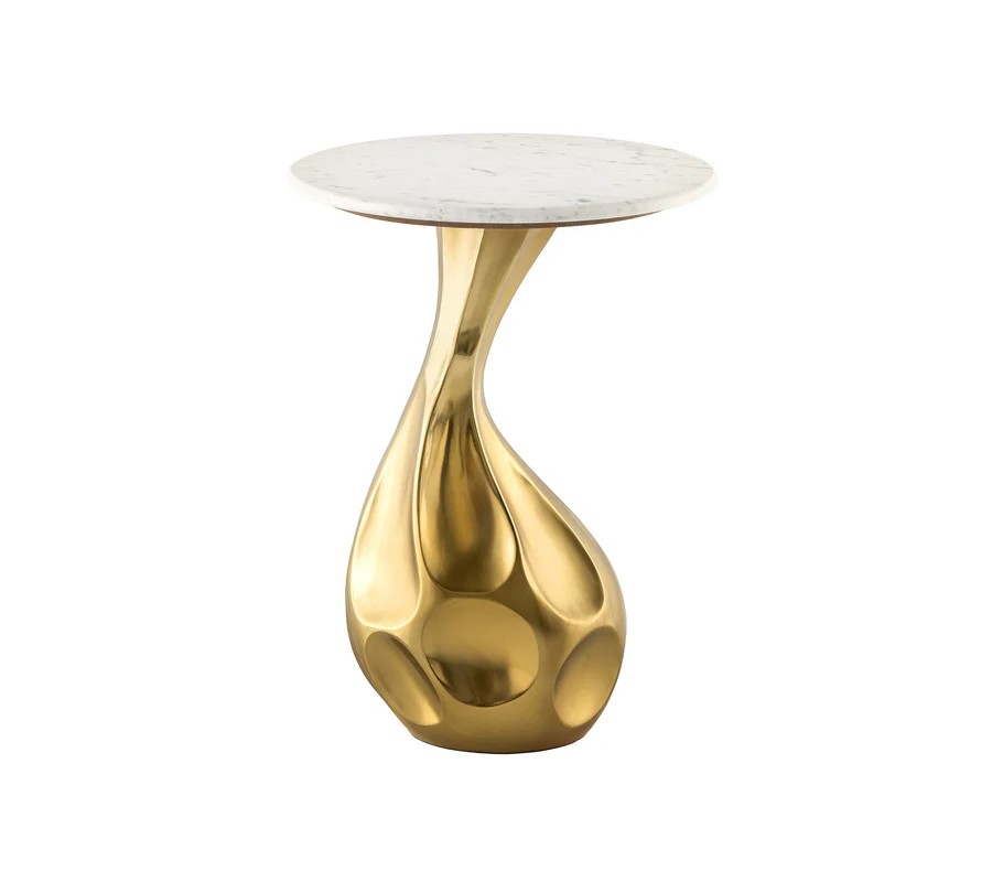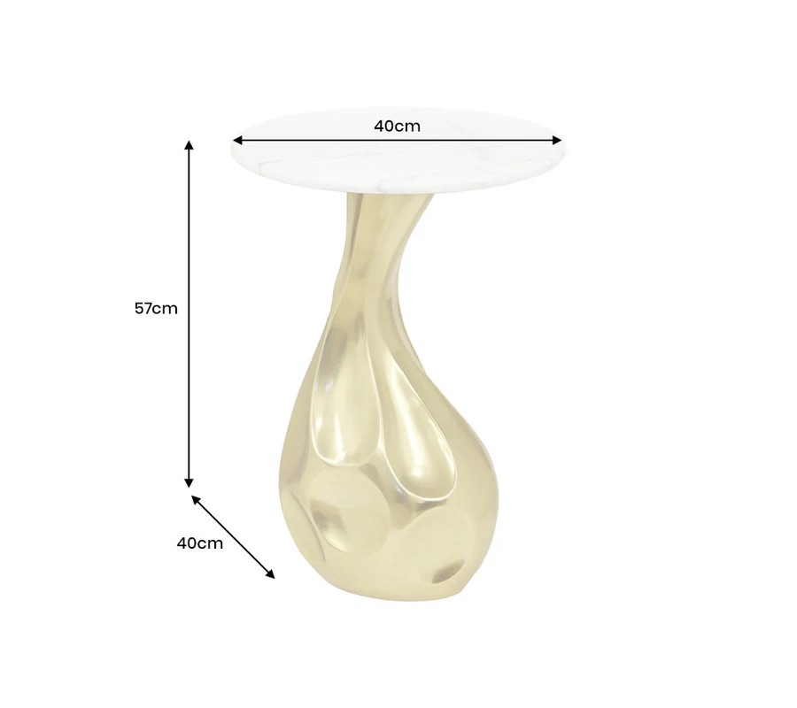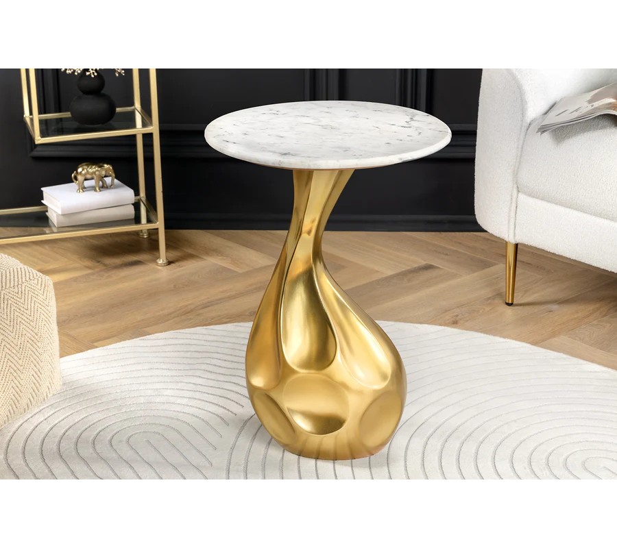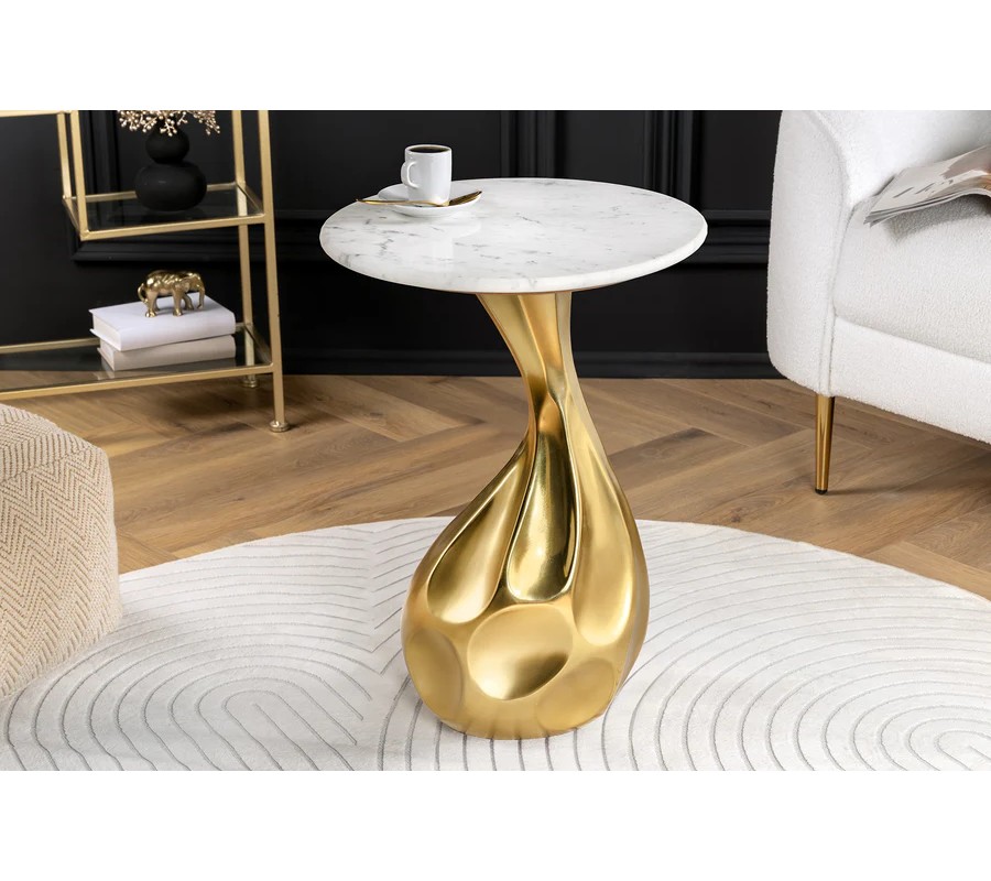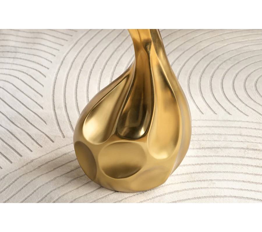 Príručný stolík s výrazným a umeleckým dizajnom spája sofistikovaný tvar a luxusné materiály. Podstava stolíka je vyrobená z kovu v zlatej farbe s vysokým leskom, ktorá svojím tvarom pripomína organické línie kvapky. Povrch základne je hladký, no zároveň ozvláštnený jemnými preliačinami, ktoré dodávajú dizajnu dynamiku a moderný vzhľad.