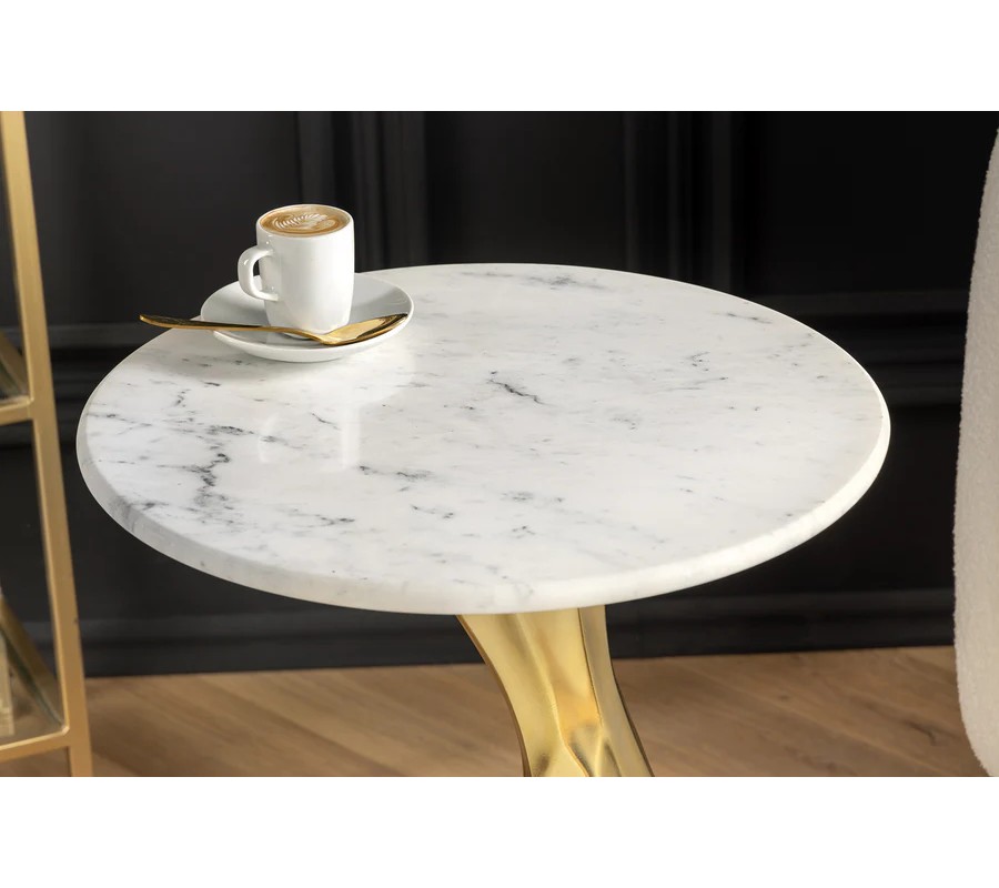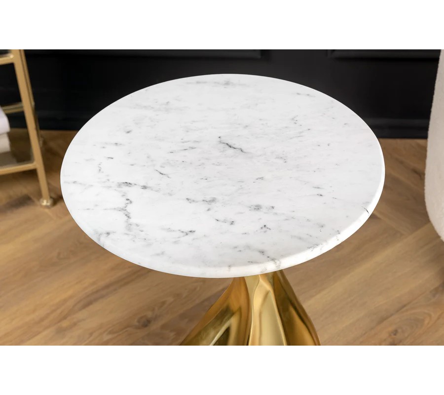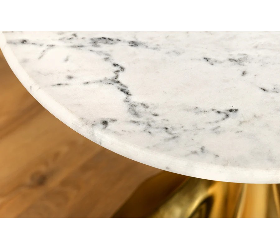 Vrchná doska stolíka je okrúhla, vyrobená z bieleho mramoru s jemnými šedými žilkami, čo vytvára elegantný kontrast k zlatej podstave. Mramorový povrch pôsobí luxusne a nadčasovo.