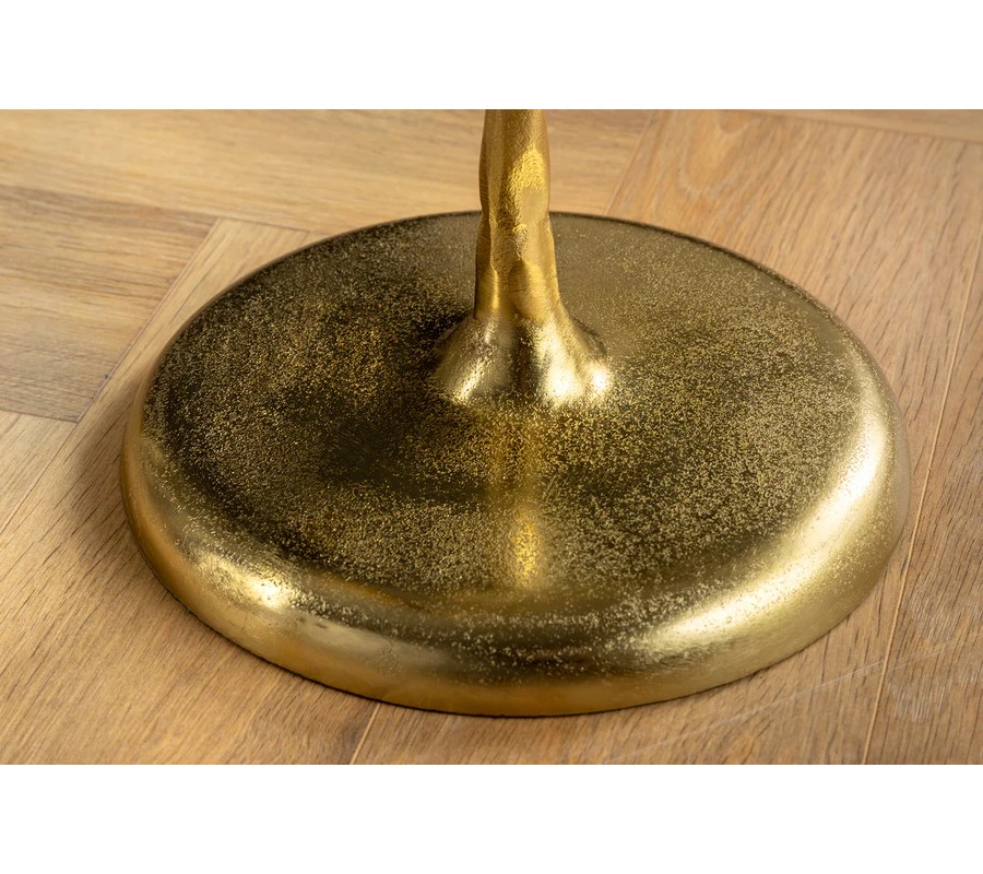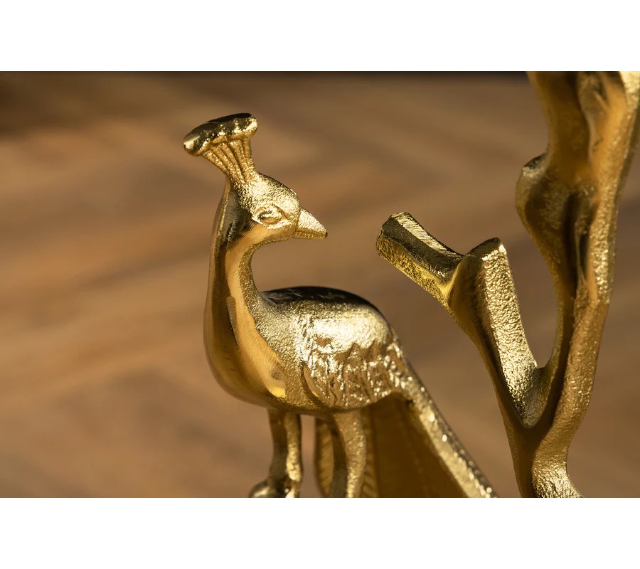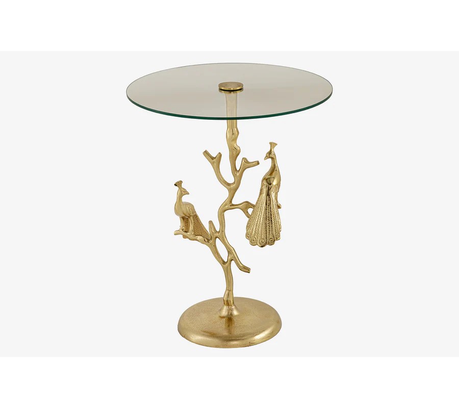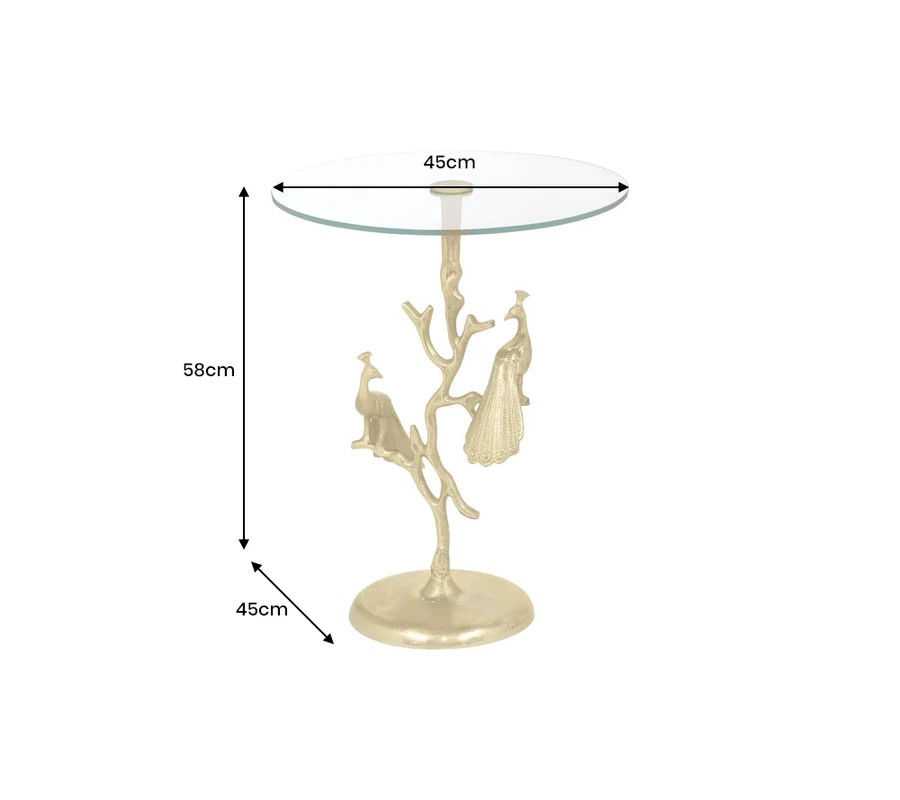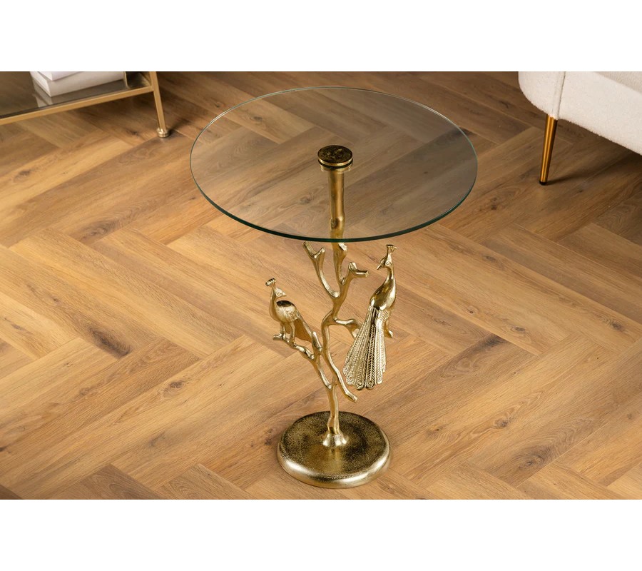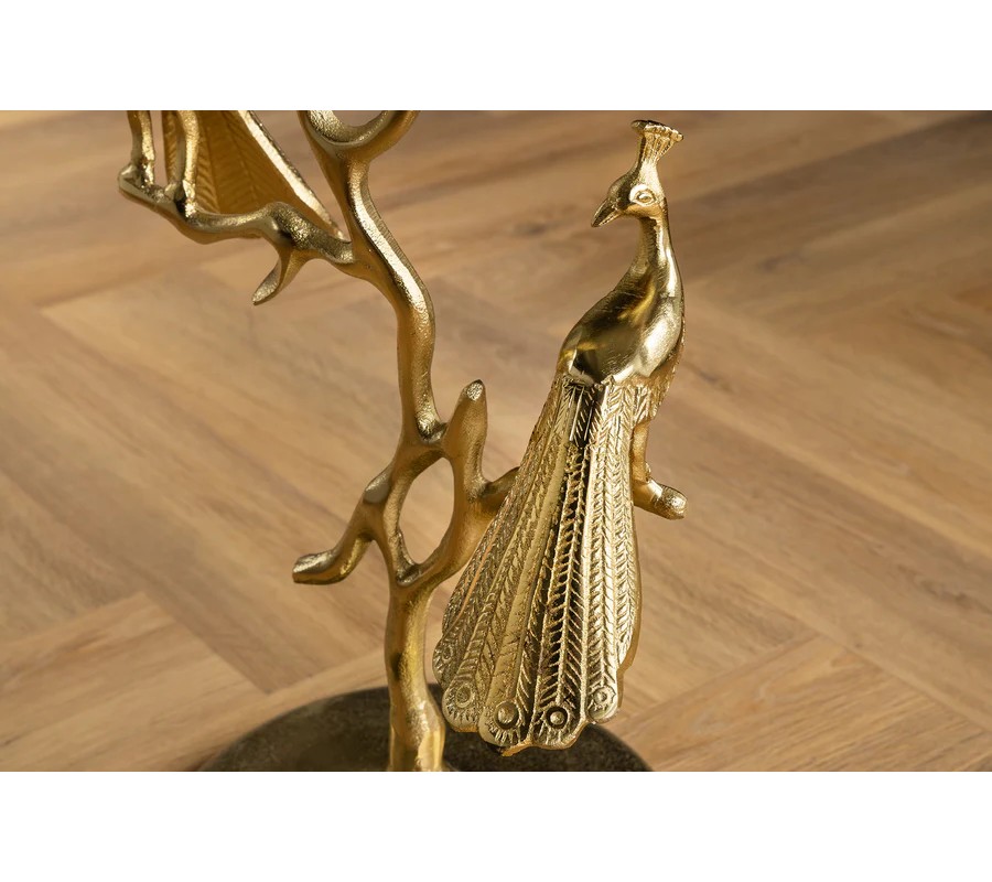 Príručný stolík s jedinečným dizajnom zobrazuje elegantnú kompozíciu dvoch pávov sediacich na vetve stromu. Noha stola je vyrobená z kovu v zlatej farbe s jemne lesklým povrchom, ktorý zvýrazňuje detaily pávov a textúru vetiev. Pávy sú detailne prepracované, najmä ich perá, ktoré dodávajú stolíku umelecký charakter.