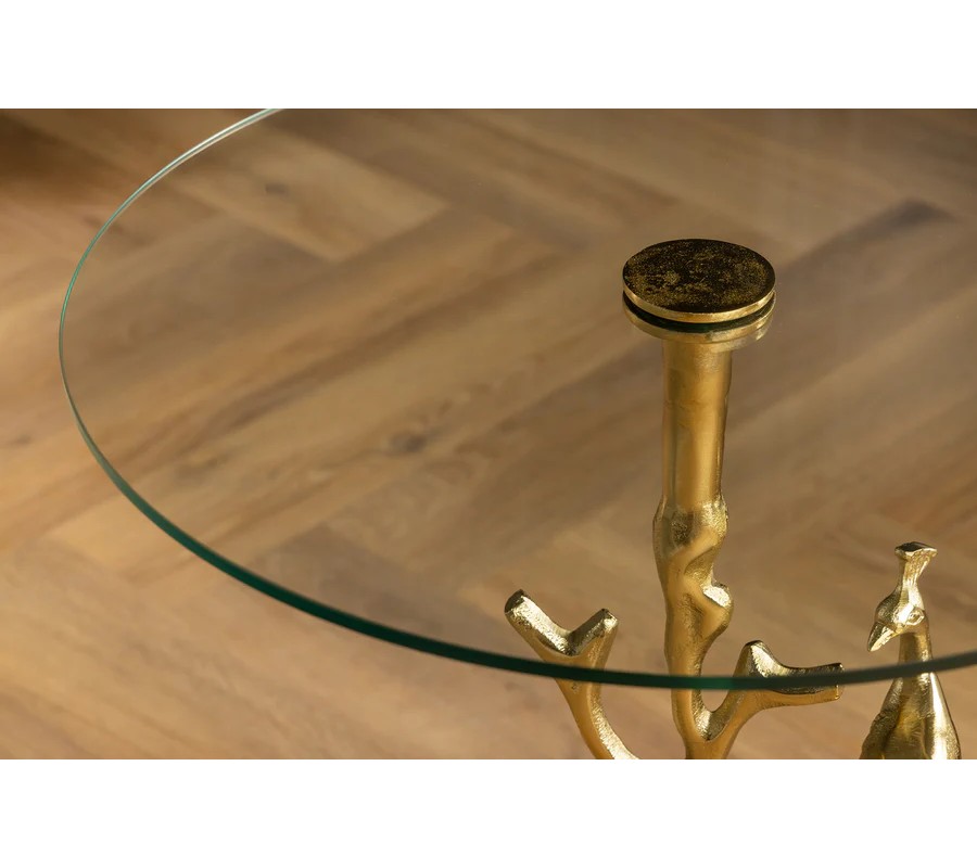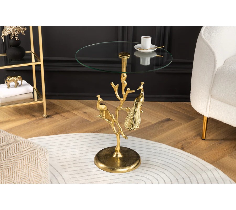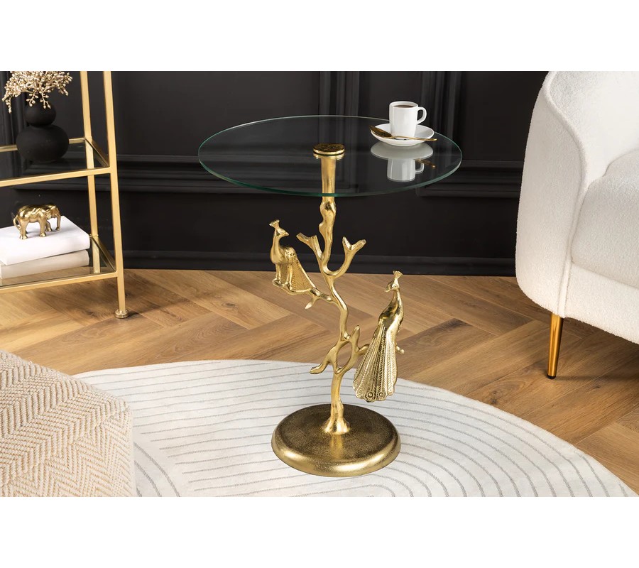 Štýlový art deco kovový príručný stolík Tierra Glam s okrúhlou sklenenou doskou a nohou v podobe zlatých pávov 60 cm