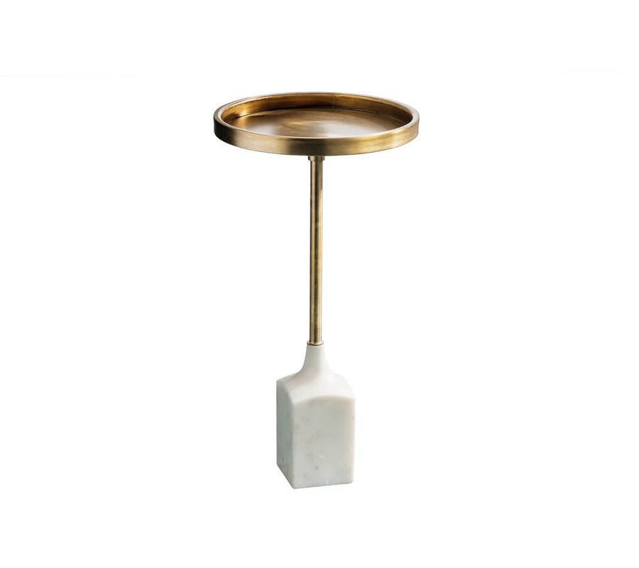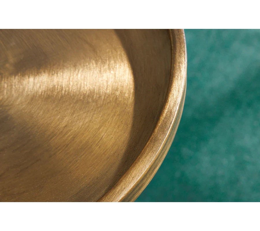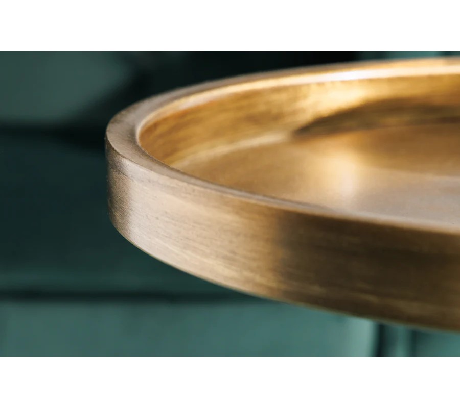 Príručný Akina stolík so zaujímavým dizajnom kombinuje prémiové materiály a elegantné tvary. Okrúhla doska je vyrobená z kovu v zlatom antickom odtieni, s hladkým povrchom a jemným leskom, ktorý pridáva luxusný nádych. Jej okraje sú vyvýšené, čím dodáva vzhľad podnosu. Štíhla kovová tyč rovnakého odtieňa vytvára vizuálnu ľahkosť a spája hornú dosku s podstavou.