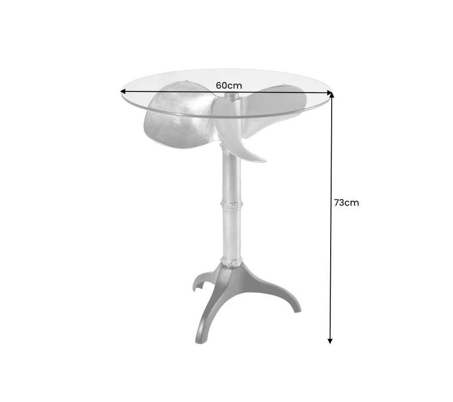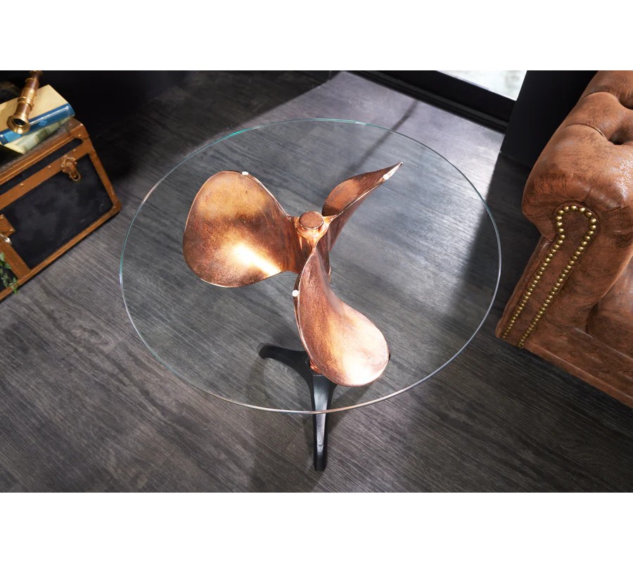 Príručný stolík Helice kombinuje industriálny a námorný dizajn s netradičnými materiálmi a tvarmi. Vrchná doska je vyrobená z číreho pevného bezpečnostného skla s hladkým povrchom, ktorý vytvára elegantný kontrast s kovovým podstavcom. Kovová noha stolíka imituje tvar lodnej vrtule, pričom má povrch v medenom odtieni s jemnou patinou, ktorá zdôrazňuje rustikálny a surový vzhľad.
