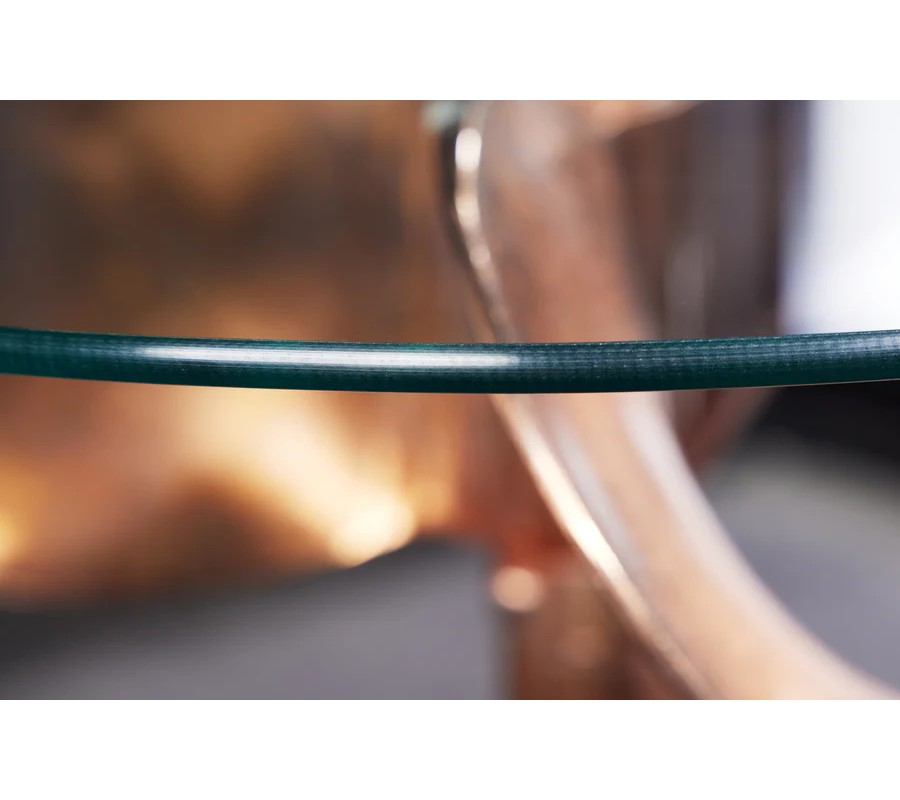 Dizajnový industriálny okrúhly kovový príručný stolík Helice v medenej farbe so sklenenou doskou 102 cm