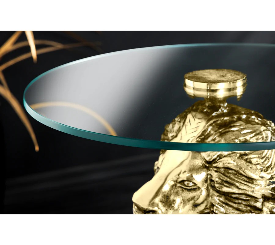 Štýlový art deco príručný stolík Tierra Glam s okrúhlou sklenenou doskou a s nohou v podobe zlatého leva 60 cm