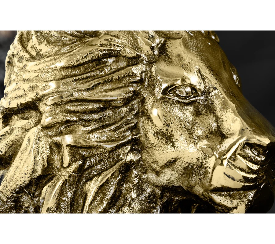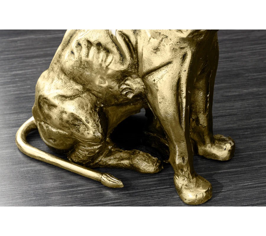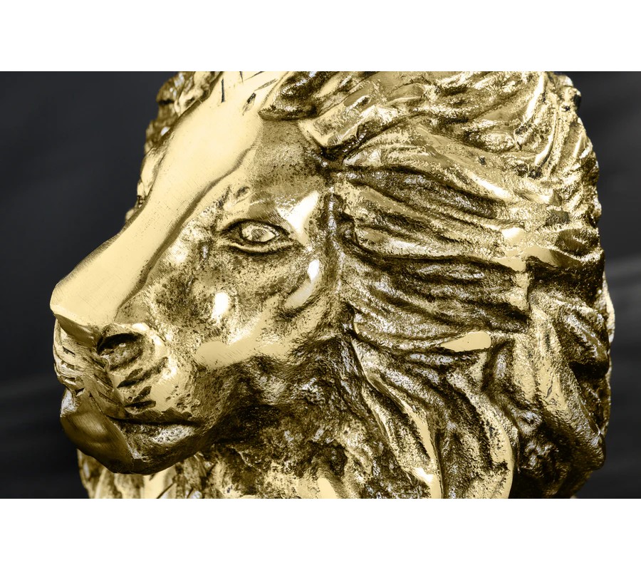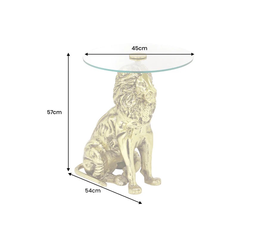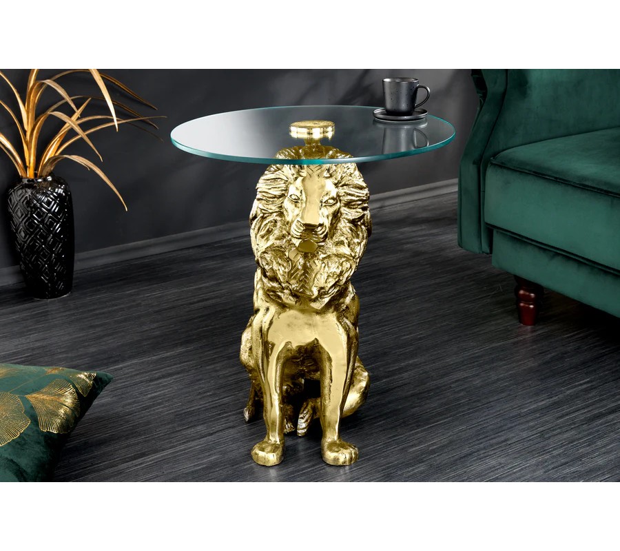 Príručný stolík s výrazným dizajnom zobrazuje majestátneho leva v sediacej polohe. Noha stola je vyrobená z kovu v zlatom prevedení, s jemne lesklým povrchom, ktorý podčiarkuje luxusný charakter. Detailné prepracovanie hrivy, svalov a celkovej štruktúry leva dodáva stolíku jedinečný vzhľad a robí ho umeleckým kúskom.
