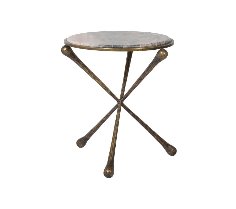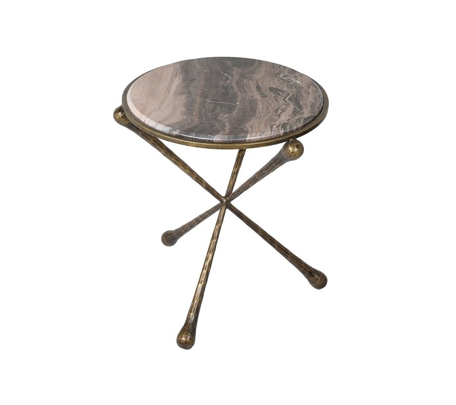 Luxusný vintage okrúhly príručný stolík Esqueleto s hnedou mramorovou doskou a prekríženými nohami v zlatej farbe 57 cm