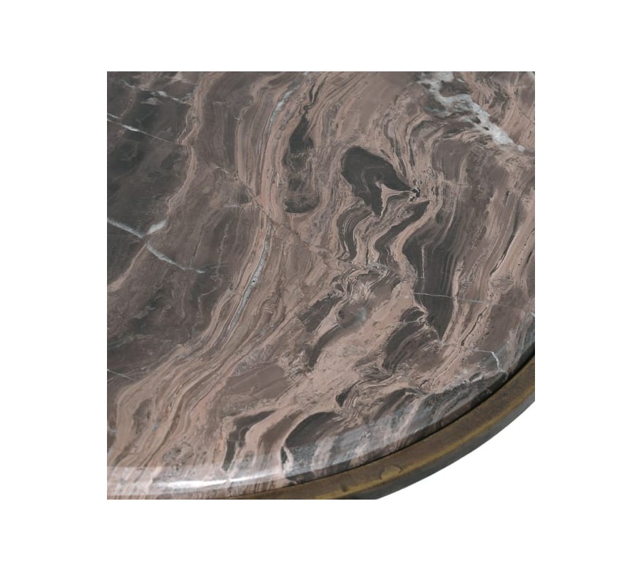 Stolík má okrúhlu vrchnú dosku, ktorá je vyrobená z mramoru. Jej lesklý hladký povrch zdobí prírodná kresba kameňa v podmanivých zemitých odtieňoch hnedej, sivej a bielej. Mramor prináša do dizajnu exkluzívny prvok a zároveň vám poskytuje pevný a na údržbu nenáročný povrch.