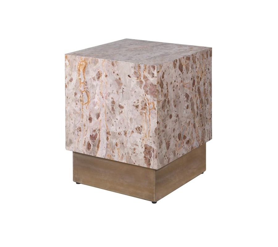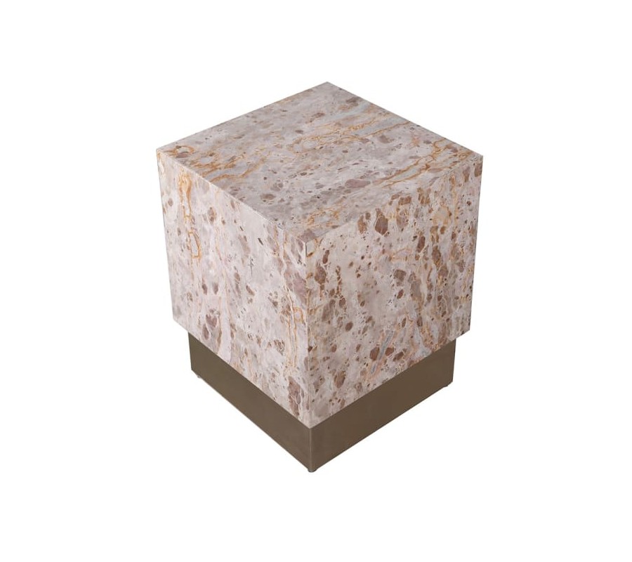 Príručný stolík má jednoduchú siluetu so štvorcovým pôdorysom. V spodnej časti je umiestnená nižšia kovová podstava, na ktorej je položená mramorová kocka, mierne prečnievajúca cez okraje podstavy. Vzniká tak zaujímavá vizuálna variácia v rámci minimalistickej lineárnej siluety a stolík pôsobí robustným dojmom.