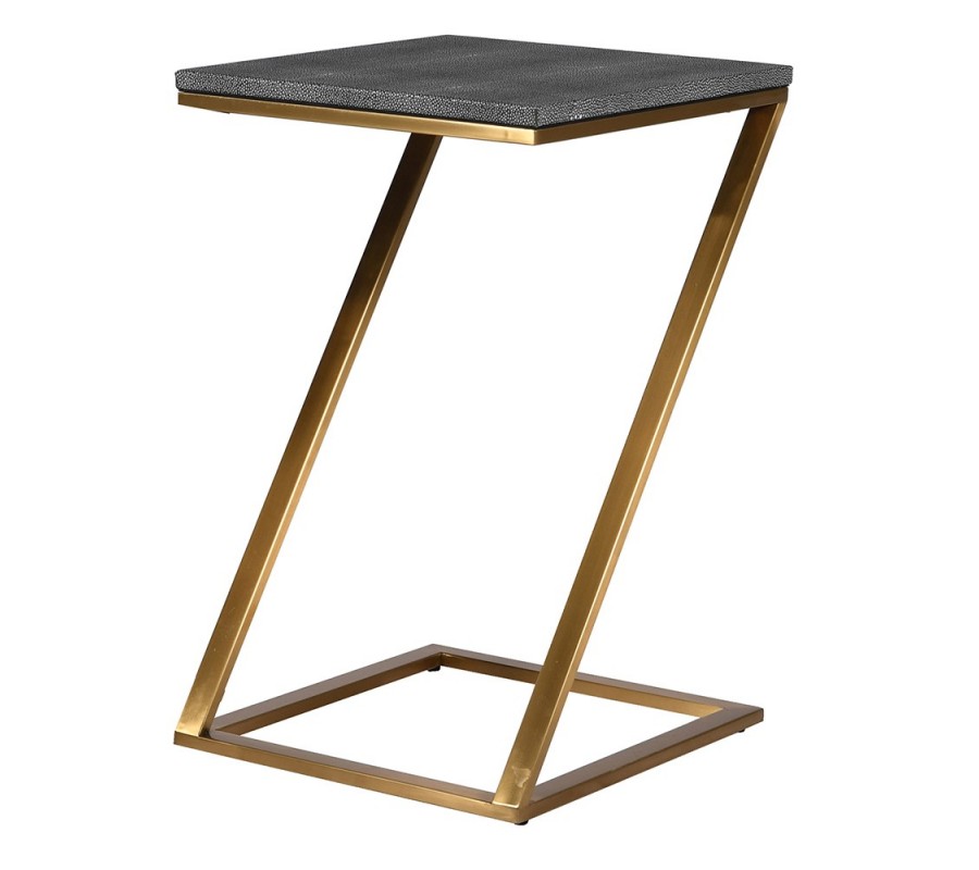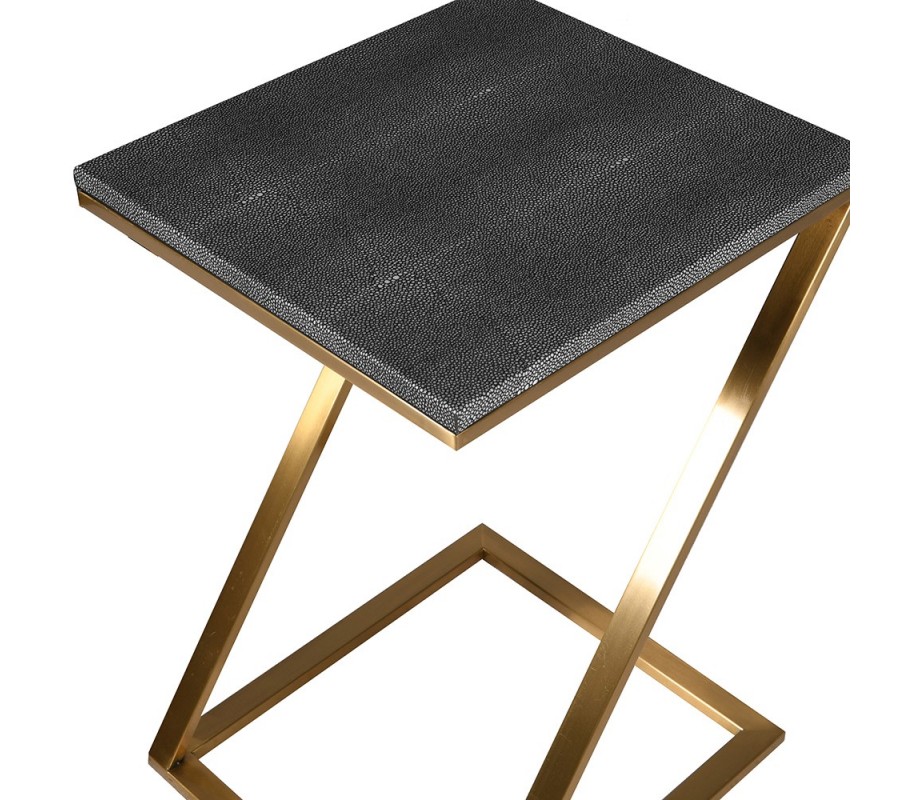 Príručný stolík Sara v sebe spája art deco a glamour štýl, čím vyniká elegantným a sofistikovaným dizajnom. Konštrukcia stolíka je vyrobená z kovu v zlatej farbe s hladkým a lesklým povrchom. Je navrhnutá v modernom štýle pripomínajúci tvar Z, kde spodný rám v obdĺžnikovom tvare zabezpečuje stabilitu, zatiaľ čo štíhle nohy elegantne prechádzajú do vrchnej dosky, čím vytvárajú vizuálnu ľahkosť a moderný dojem. Vrchná doska má štvorcový tvar a je potiahnutá nepravou šagrénovou kožou v tmavosivej až čiernej farbe. Jej povrch je jemne štruktúrovaný s charakteristickým zrnitým vzorom, ktorý pridáva na jedinečnosti a luxuse. Tento stolík je ideálny do obývacích izieb, spální či luxusných kancelárií, kde sa hodí ako príručný alebo dekoratívny prvok. Perfektne sa kombinuje s tmavým drevom, zlatými alebo čiernymi doplnkami a textíliami, ako je zamat alebo hodváb, pričom vynikne v interiéroch s dôrazom na elegantné a luxusné detaily.