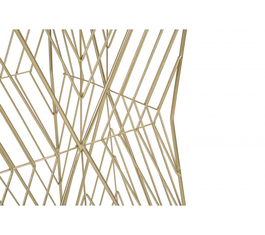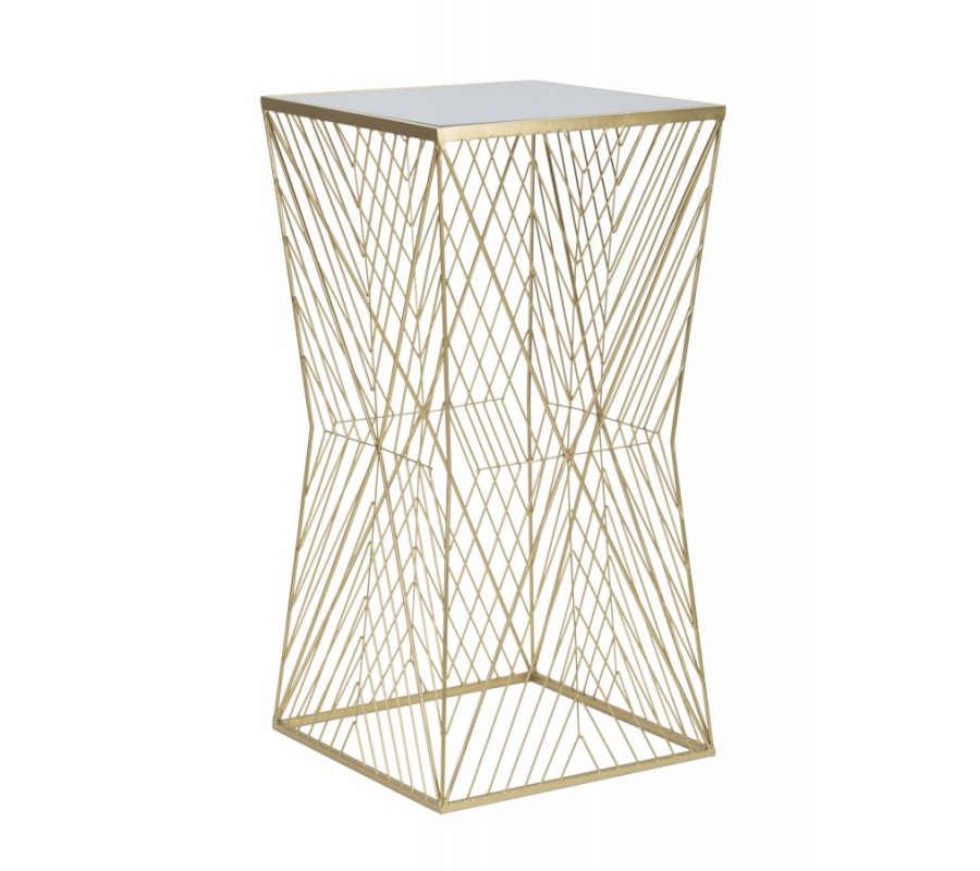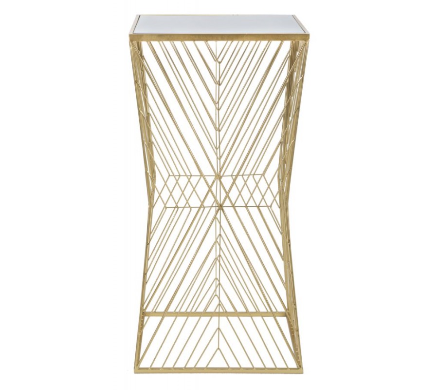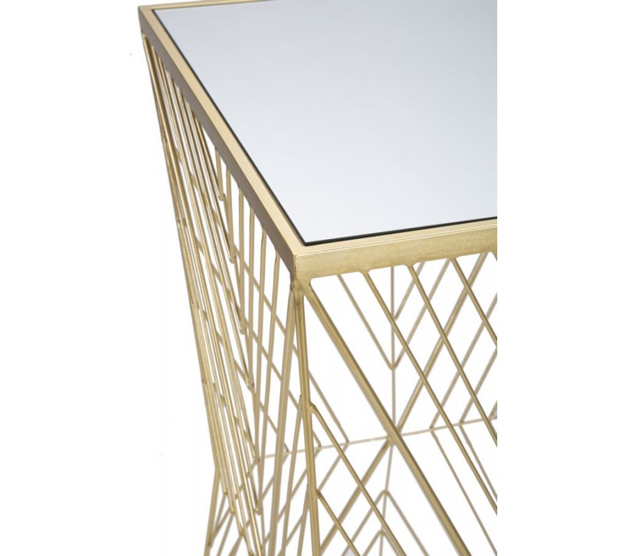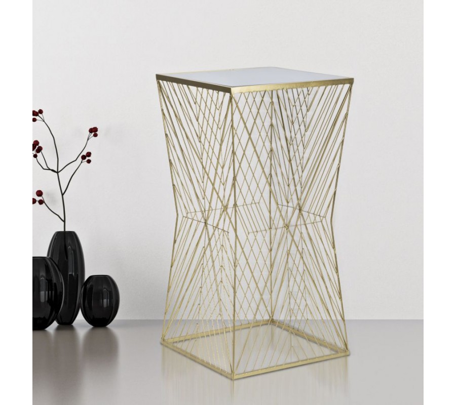 Príručný art deco stolík Dimension sa vyznačuje elegantnou a prepracovanou konštrukciou, ktorá spája luxusný vzhľad s modernou geometriou. Jeho základ aj vrchná doska majú štvorcový tvar, čo vytvára stabilnú a harmonickú štruktúru. Rám je kovový s povrchovou úpravou v zlatej farbe, ktorá dodáva stolíku sofistikovaný glamour nádych, pričom jeho prepletené línie vytvárajú na stranách vzor v tvare X a v strede elegantné zúženie. Zlatý kov je spracovaný do jemných, prekrížených línií, ktoré sa pravidelne opakujú a vytvárajú dynamický vizuálny efekt. Tento prepletený vzor dodáva stolíku vzdušnosť, pričom jeho konštrukcia zostáva pevná a stabilná.