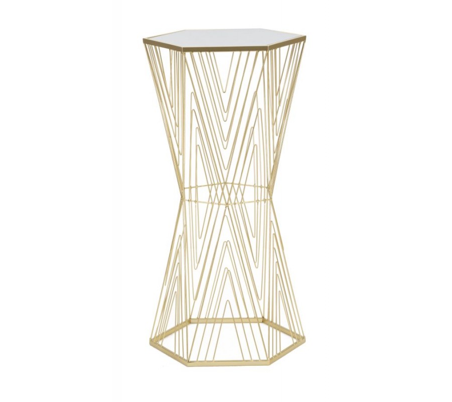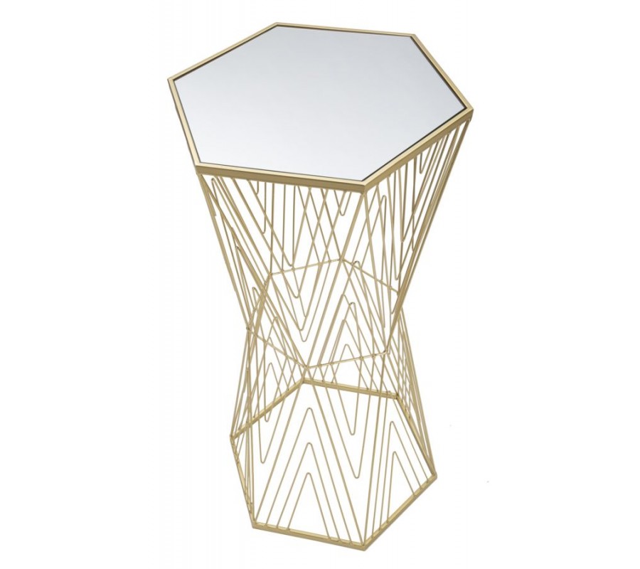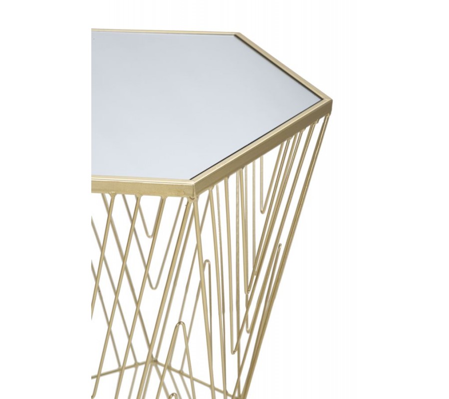 Príručný stolík Dimension v sebe spája luxusný dizajn a precízne spracovanie. Šesťuholníková zrkadlová doska vytvára elegantný svetelný odraz, ktorý umocňuje vzhľad celého stolíka. Táto moderná plocha je lemovaná kovovým rámom v zlatej farbe, ktorý zabezpečuje stabilitu a dodáva mu sofistikovaný vzhľad.