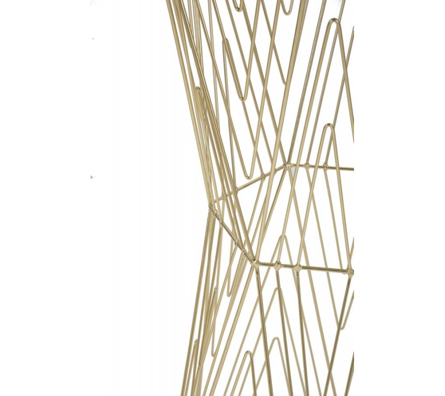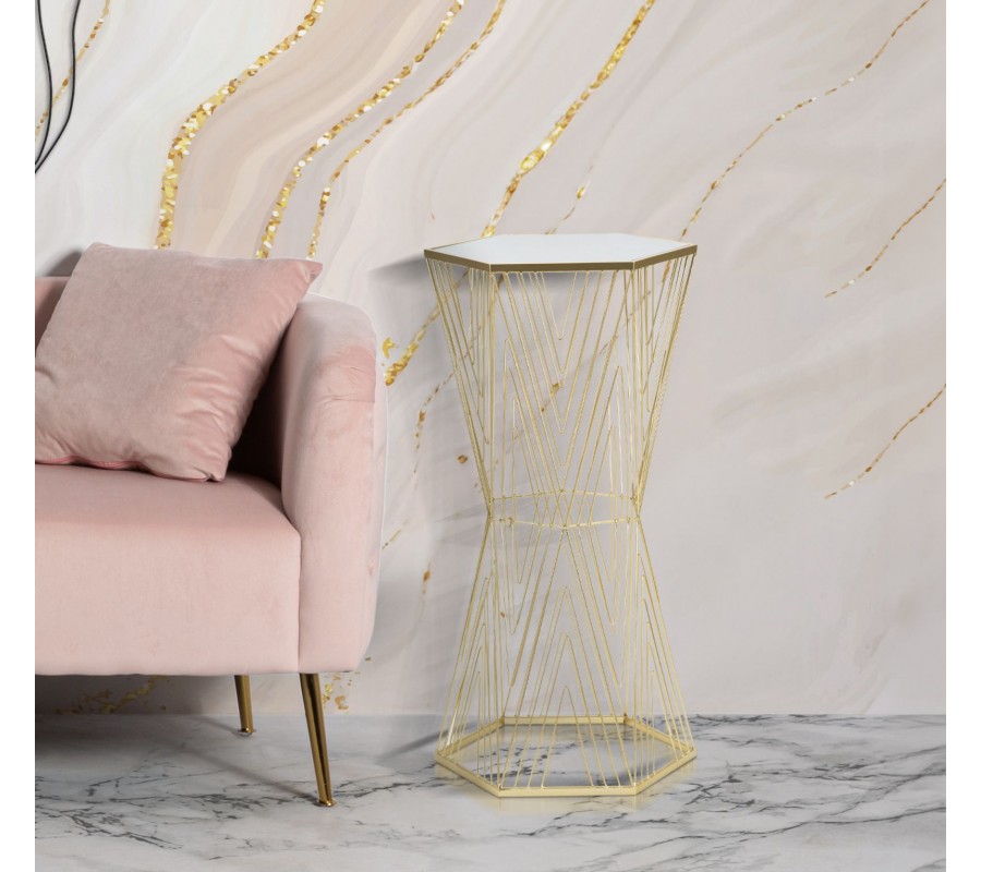 Hlavným dizajnovým prvkom je geometrická kovová podstava, ktorá svojím spleteným vzorom evokuje umelecký a vzdušný dizajn. Zlaté kovové línie vytvárajú dynamickú kompozíciu, ktorá stolík vizuálne odľahčuje, no zároveň mu dodáva pevnosť. Tento extravagantný dizajn je ideálny pre interiéry v štýle glamour a art deco, kde sa stane výrazným prvkom priestoru.