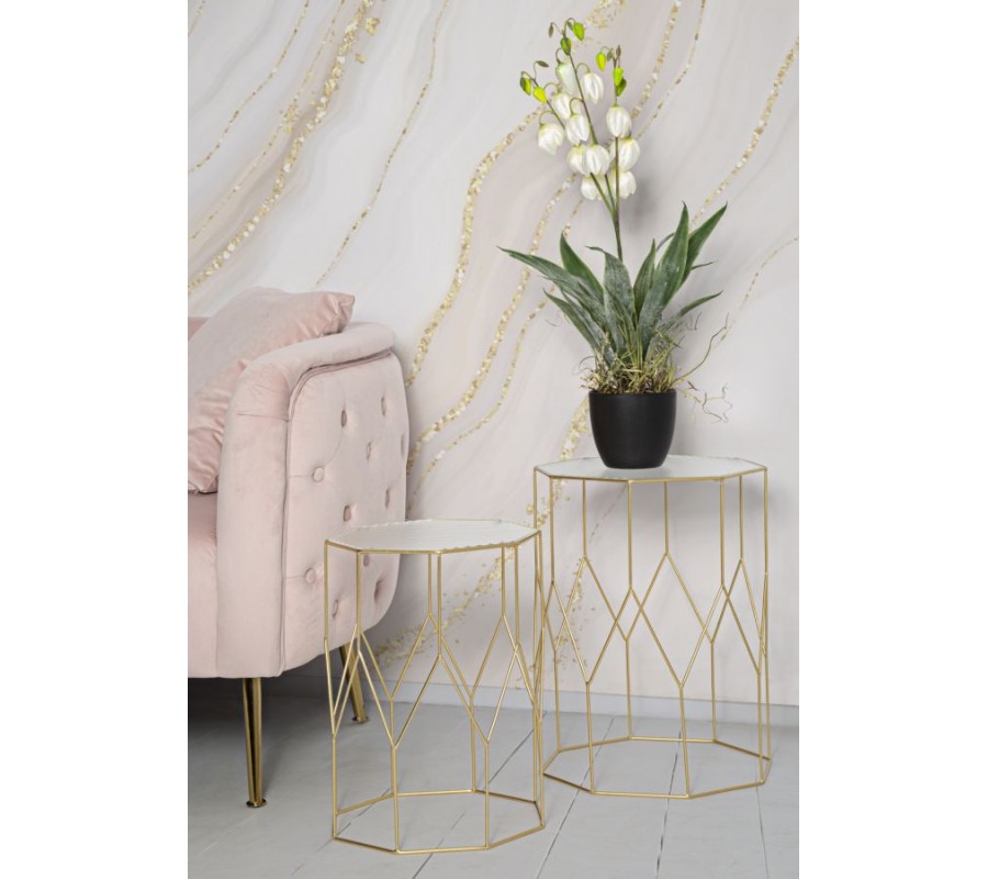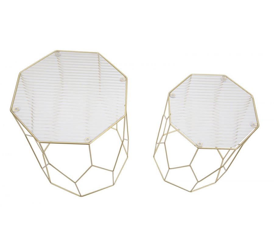 Sada dvoch príručných stolíkov Lamier v štýle art deco a glamour kombinuje geometrickú eleganciu so vzdušným dizajnom. Ich osemuholníková konštrukcia je vyrobená z kovu v zlatej farbe a nohy sú tvarované do kosoštvorcového vzoru, ktorý dodáva stolíkom jemnú symetriu a vizuálnu ľahkosť.