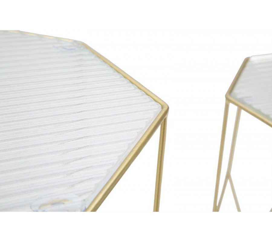 Vrchná doska je vyrobená zo skla, ktoré je jemne priesvitné a má vrúbkovaný povrch, čím vytvára rafinovaný efekt lomu svetla. Tento detail podčiarkuje luxusný charakter stolíkov a zvyšuje ich estetickú hodnotu. Vyšší stolík má rozmery 47 × 37 cm, zatiaľ čo nižší model meria 42 × 31 cm, čím ponúka flexibilitu pri ich umiestnení.