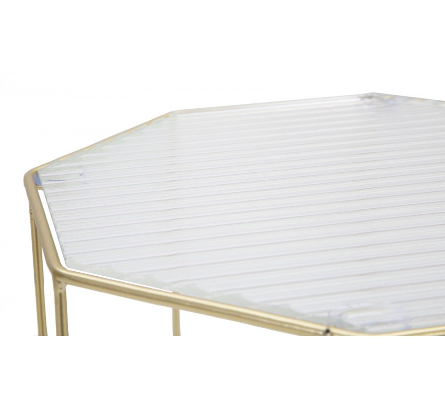 Art deco sada osemuholníkových kovových zlatých príručných stolíkov Lamier so sklenenou vrúbkovanou vrchnou doskou 47 cm