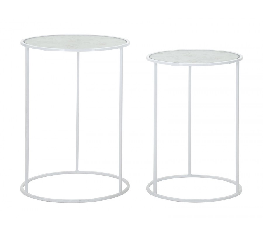 Sada okrúhlych príručných stolíkov Selly v bielej farbe s elegantným dizajnom v štýle art deco a glamour elegantne zapadne do vašej obývačky. Konštrukcia je kovová, jemná a vzdušná, pričom nožičky sa skladajú z troch tenkých tyčí a spodného kruhového rámu, ktorý zabezpečuje stabilitu. Menší stolík sa dá zasunúť pod väčší, čím vytvára praktický a variabilný set.