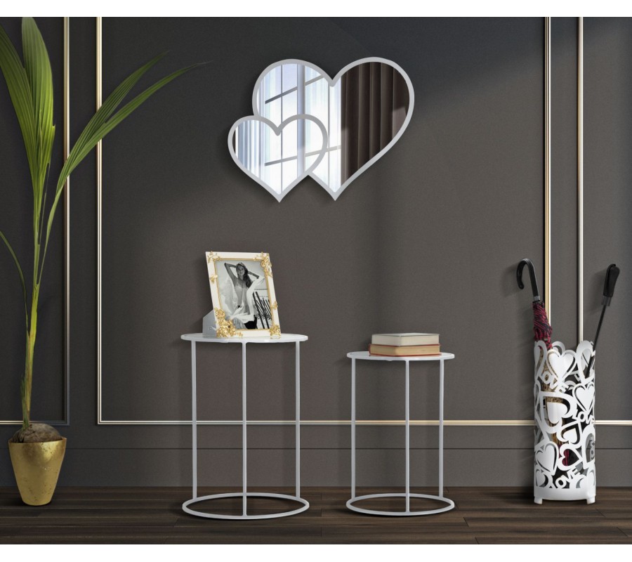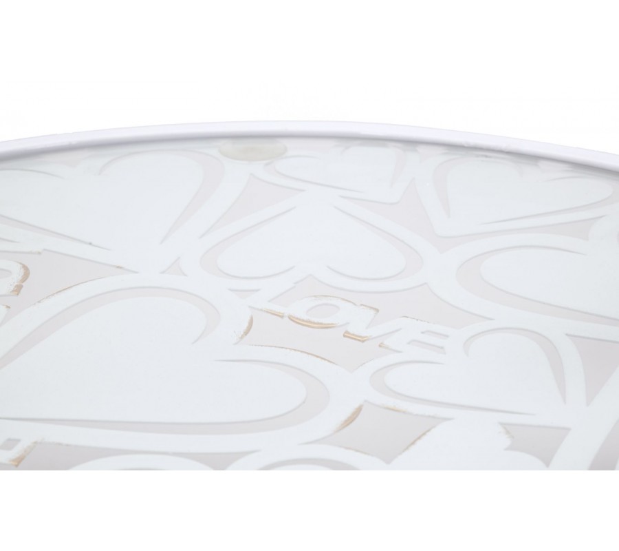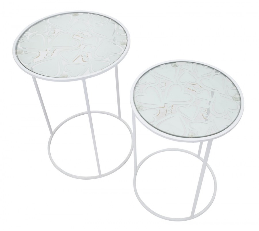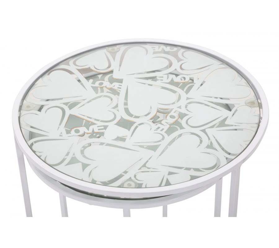 Glamour sada okrúhlych kovových bielych príručných stolíkov Selly so sklenenou vrchnou doskou s dekoračnými srdcami 60 cm