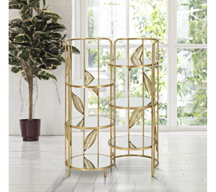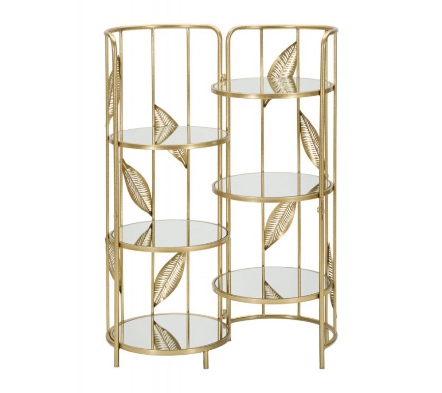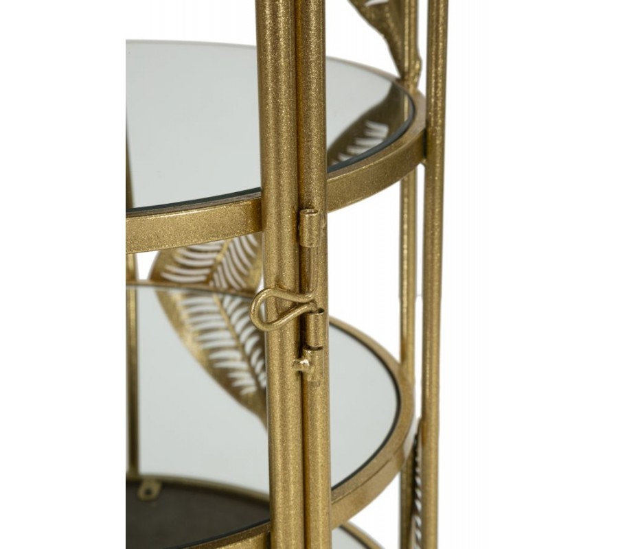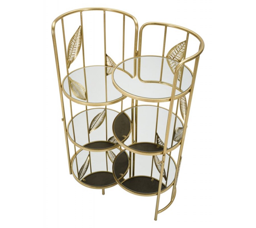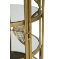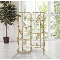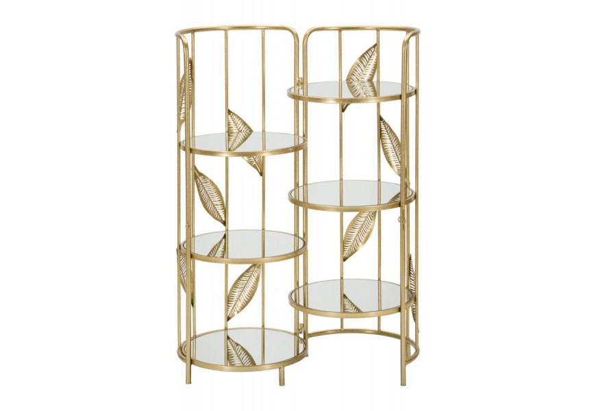 Dizajnový glamour skladací regál Natura Elegante v zlatej farbe s florálnym zdobením a zrkadlovými policami 90 cm