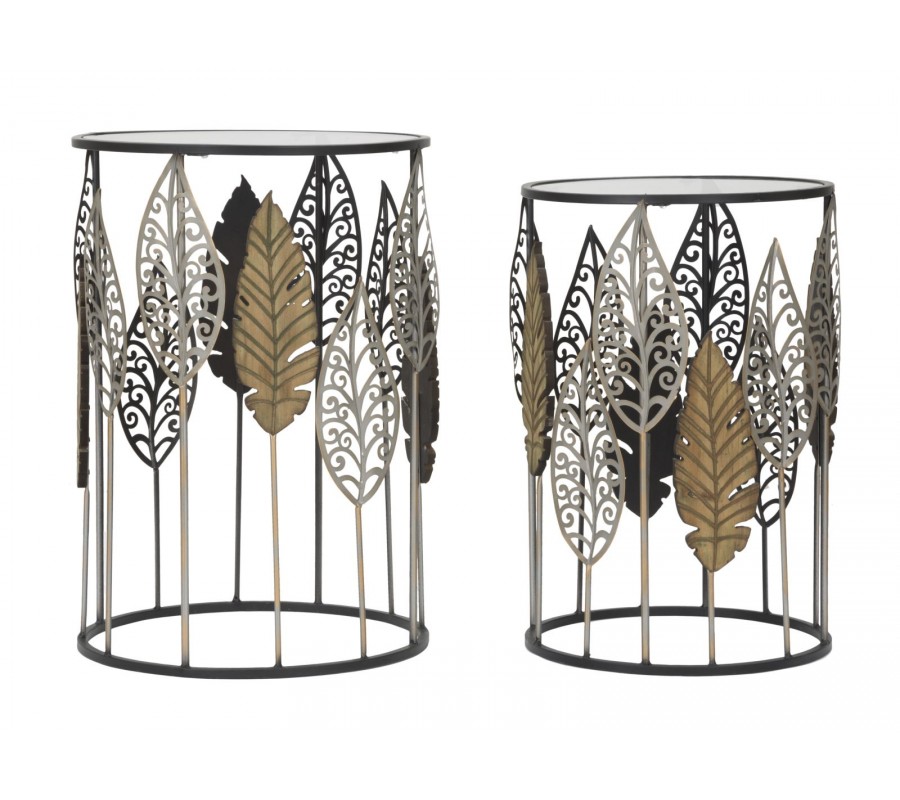 Sada príručných stolíkov Foliera v glamour štýle sa vyznačuje elegantným dizajnom s prírodnými motívmi. Stolíky sa líšia výškou, pričom vyšší pôsobí dominantnejšie a menší je jeho ideálnym doplnkom. Väčší stolík má rozmery 38 x 55 x 38 cm, zatiaľ čo menší stolík má rozmery 33 x 50 x 33 cm. Okrúhle vrchné dosky z priehľadného skla umožňujú vyniknúť dekoratívnemu kovovému rámu v čiernej farbe, ktorý je zdobený prepracovanými listovými vzormi.