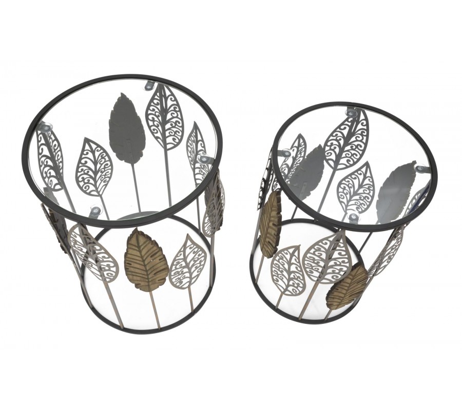 Dizajnová glamour sada okrúhlych príručných stolíkov Foliera so sklenenou doskou a čiernym kovovým rámom s listami 55 cm