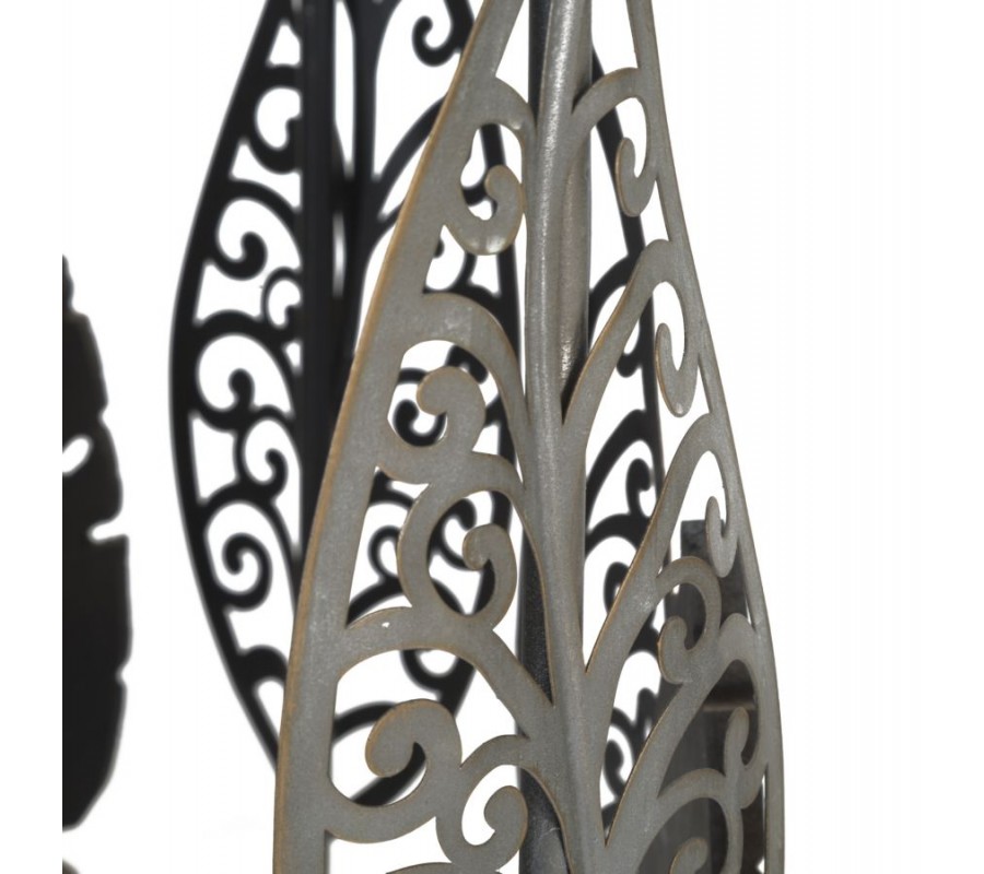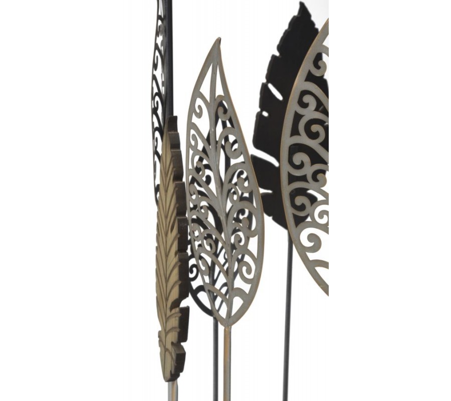 Rám je zdobený dvomi typmi listov – plnými v zlatom odtieni s jemnou patinou a filigránovými striebornými listami so vzdušnými výrezmi v podobe žilkovania. Stonky týchto dekorácií vyrastajú zo spodného kovového rámu a ich rôzne výšky dodávajú stolíkom dynamický vzhľad. Niektoré listy sa šplhajú až k vrchnému rámu, čím vytvárajú ilúziu rastúcej rastliny.
