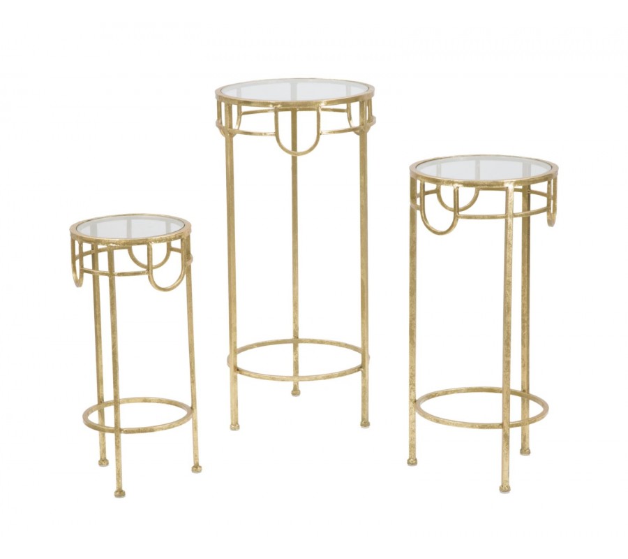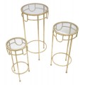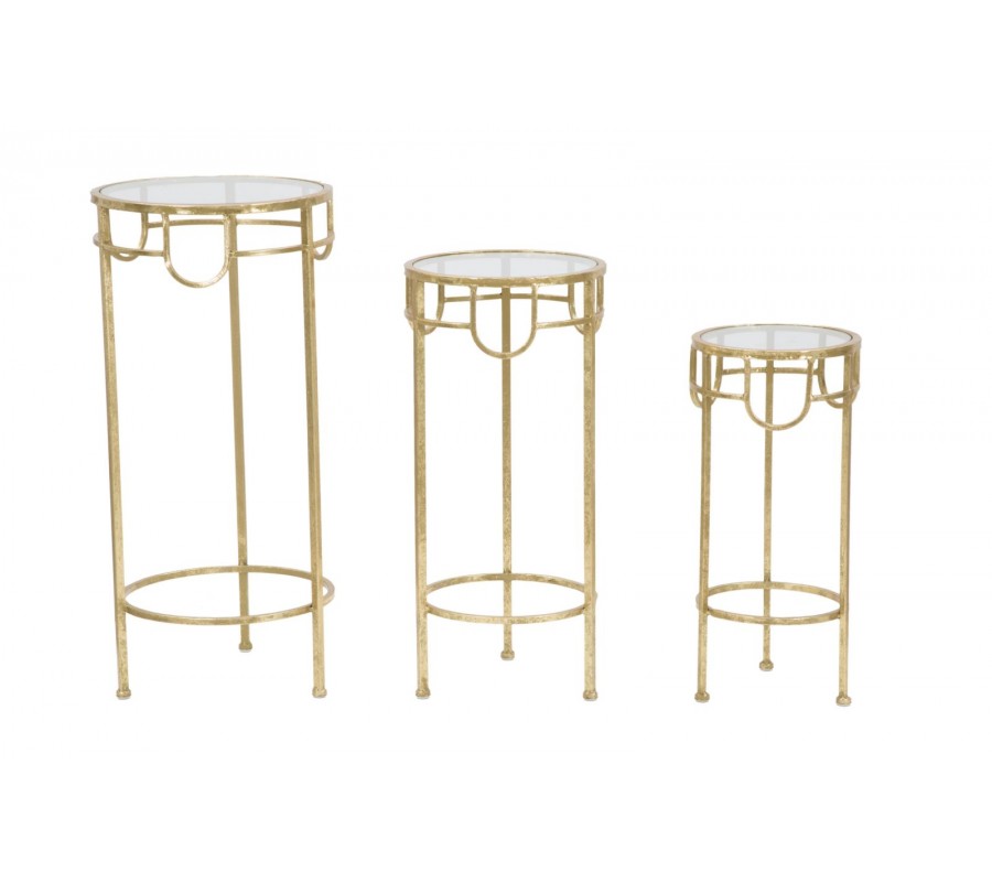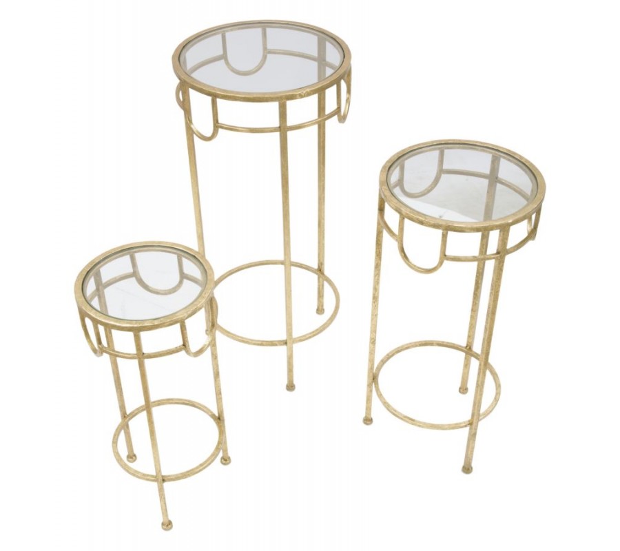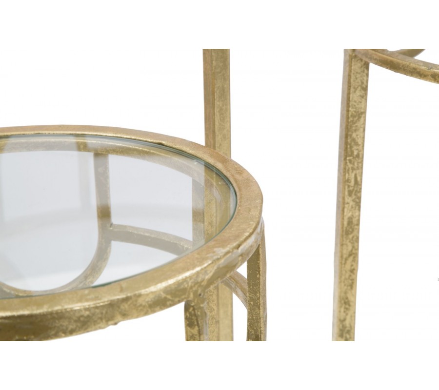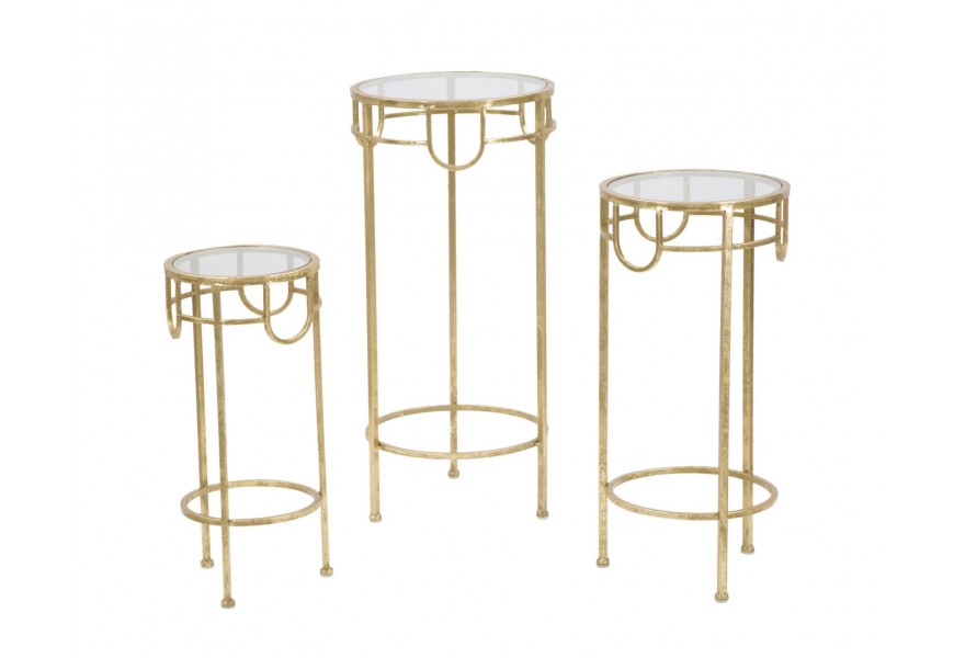Sada príručných stolíkov Solara v glamour a art deco štýle pozostáva z troch kusov rôznej výšky – veľkého, stredného a malého stolíka. Najväčší stolík má rozmery 33 × 70 × 33 cm, stredný 28 × 60 × 28 cm a najmenší 23 × 50 × 23 cm. Každý z nich má elegantnú okrúhlu vrchnú dosku z priehľadného skla, ktorá spočíva na konštrukcii zo železa v starožitnej zlatej farbe. Kovový rám má patinovaný vzhľad, ktorý dodáva celej sade sofistikovaný vintage charakter.