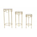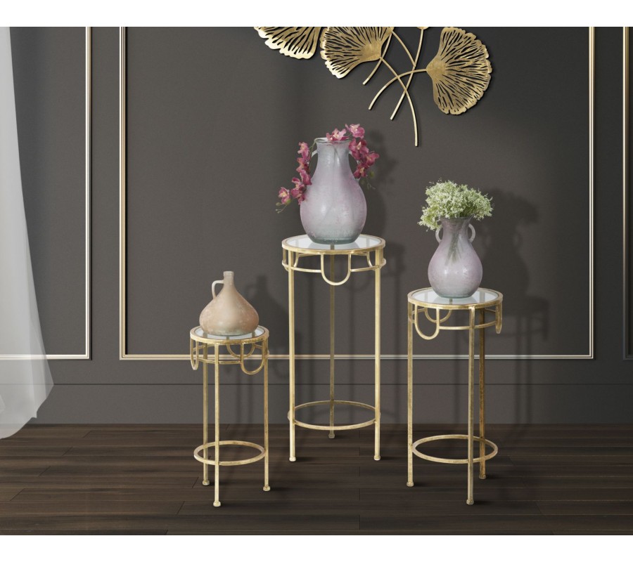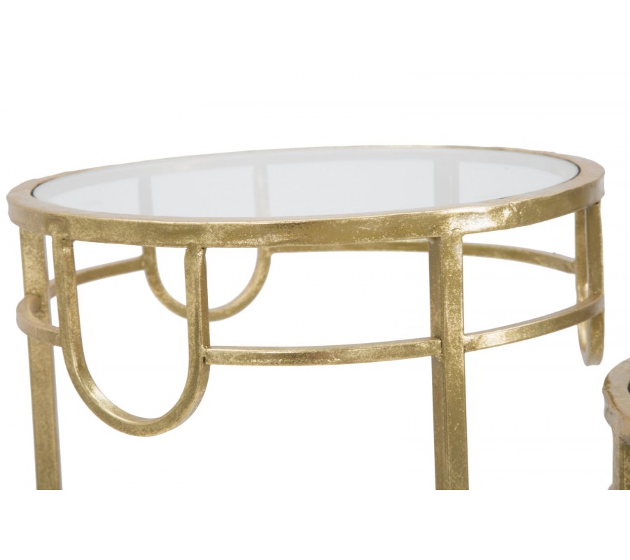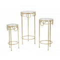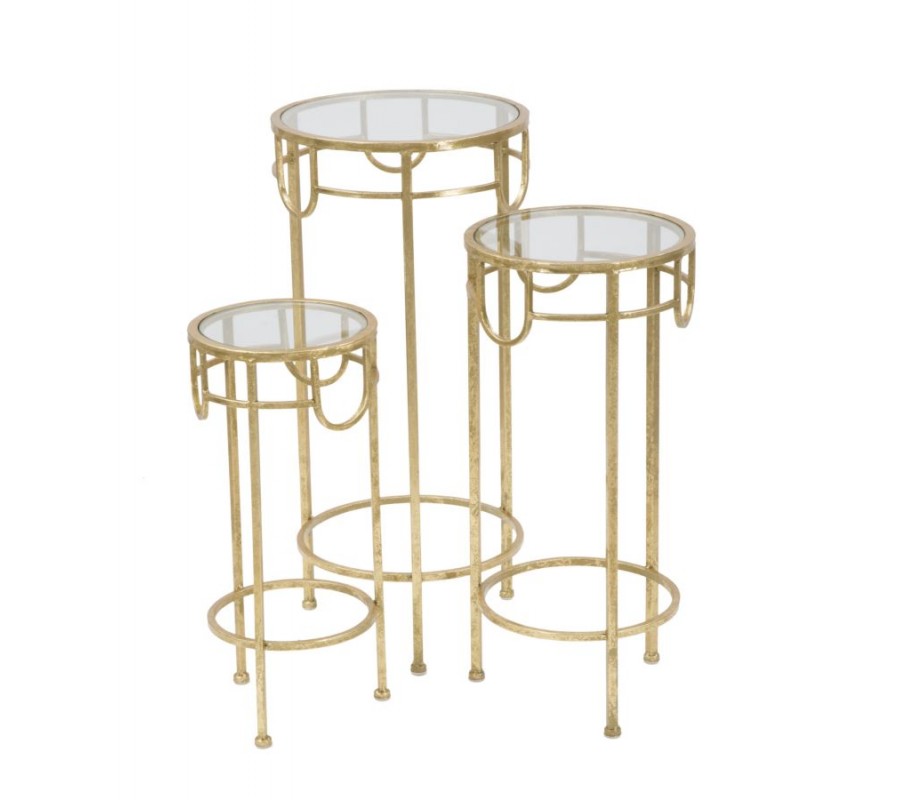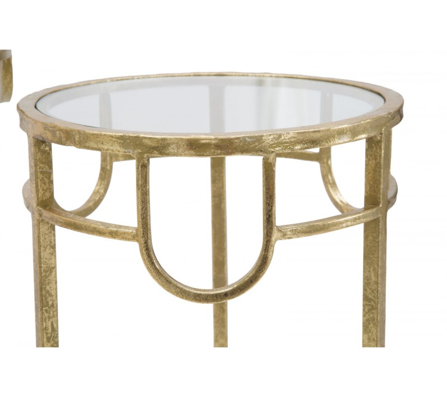 Sada príručných stolíkov Solara v glamour a art deco štýle pozostáva z troch kusov rôznej výšky – veľkého, stredného a malého stolíka. Najväčší stolík má rozmery 33 × 70 × 33 cm, stredný 28 × 60 × 28 cm a najmenší 23 × 50 × 23 cm. Každý z nich má elegantnú okrúhlu vrchnú dosku z priehľadného skla, ktorá spočíva na konštrukcii zo železa v starožitnej zlatej farbe. Kovový rám má patinovaný vzhľad, ktorý dodáva celej sade sofistikovaný vintage charakter.