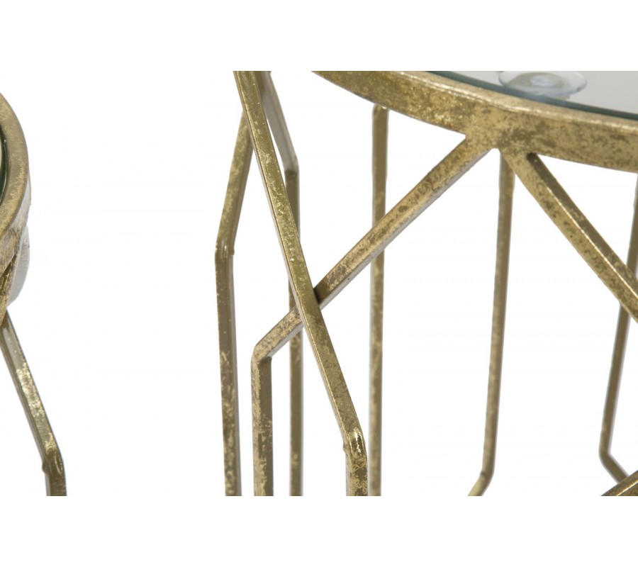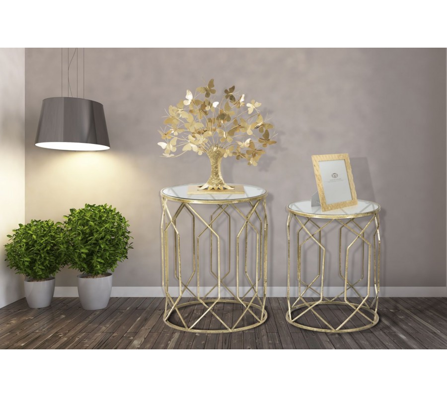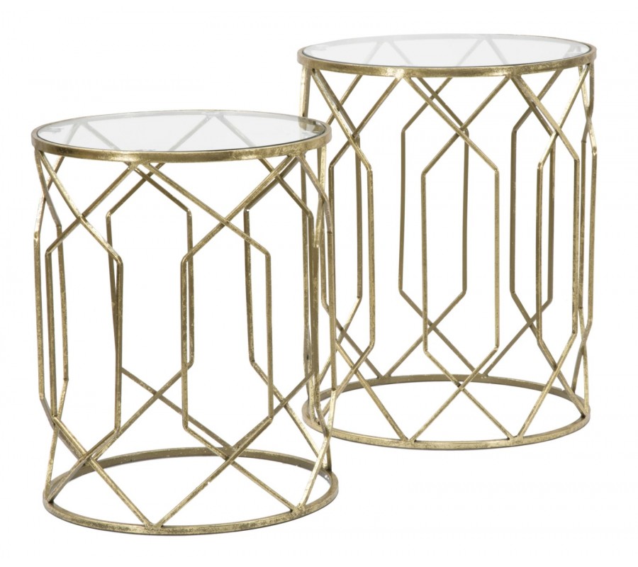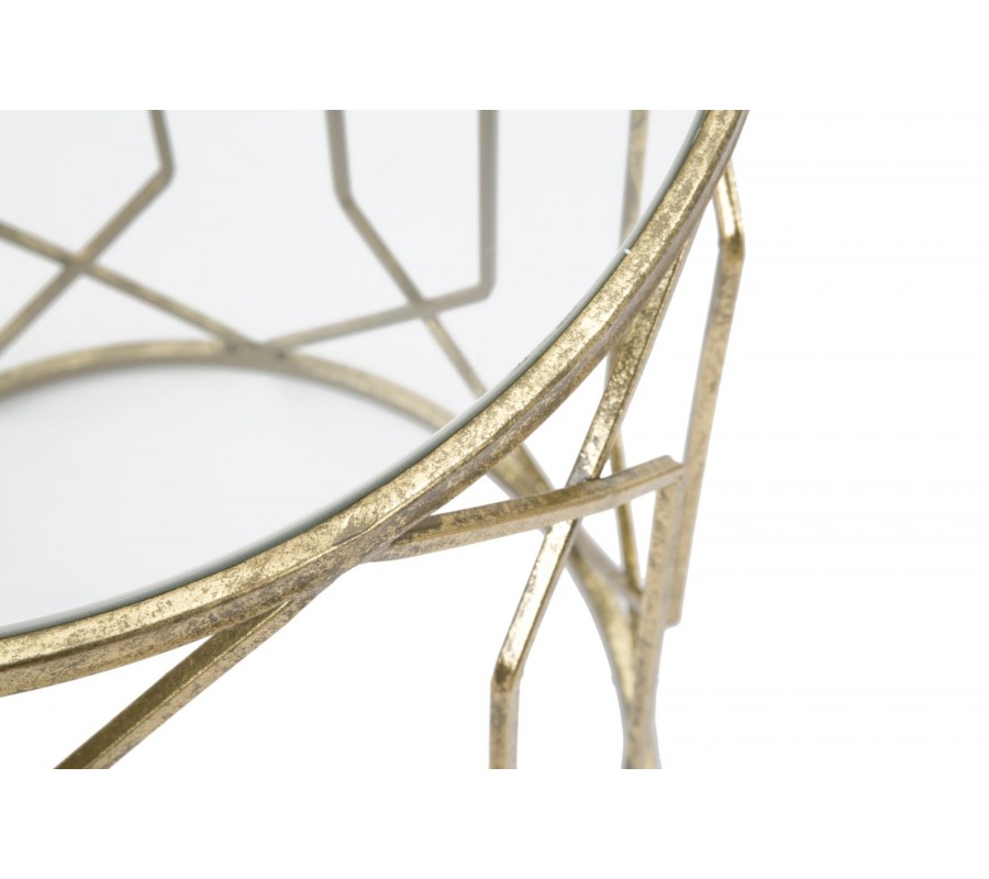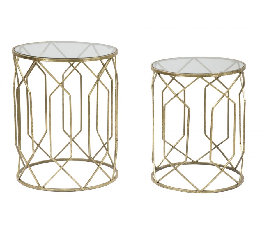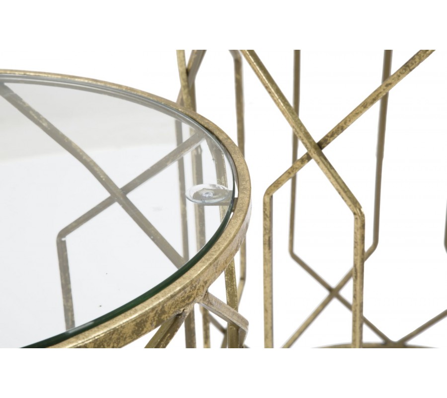 Dizajnová sada dvoch príručných stolíkov Aurelle v štýle glamour a art deco kombinuje eleganciu a precízne spracované detaily. Vrchné dosky sú okrúhle a vyrobené z priehľadného skla, čím v interiéri vytvárajú ľahký a vzdušný dojem. Rám stolíkov je zo železa v zlatej farbe s jemnou patinou, ktorá im dodáva jemný vintage charakter.