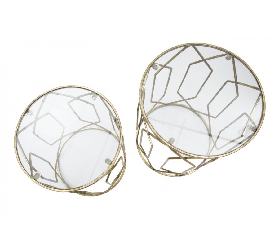 Dizajnová glamour sada okrúhlych príručných stolíkov Aurelle so sklenenými doskami a zlatým rámom s geometrickým vzorom 53 cm