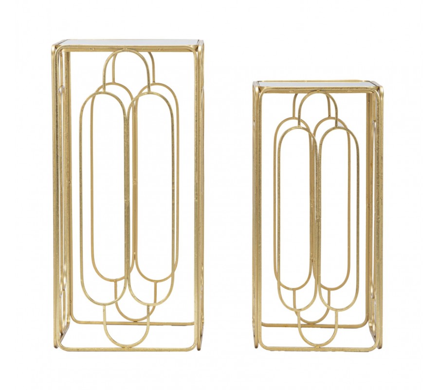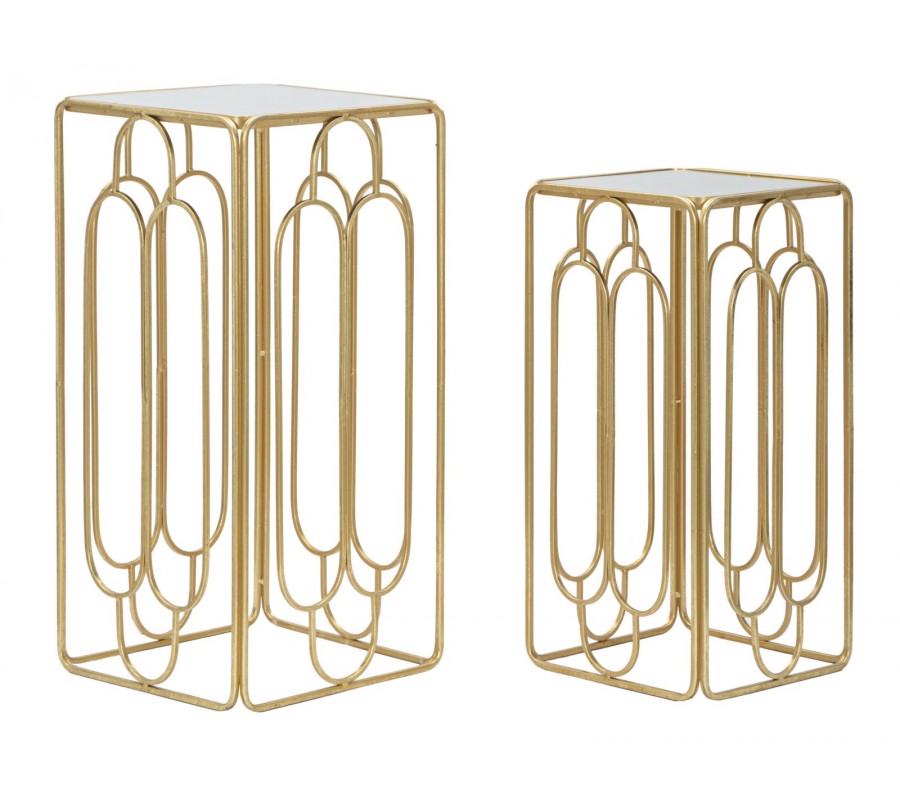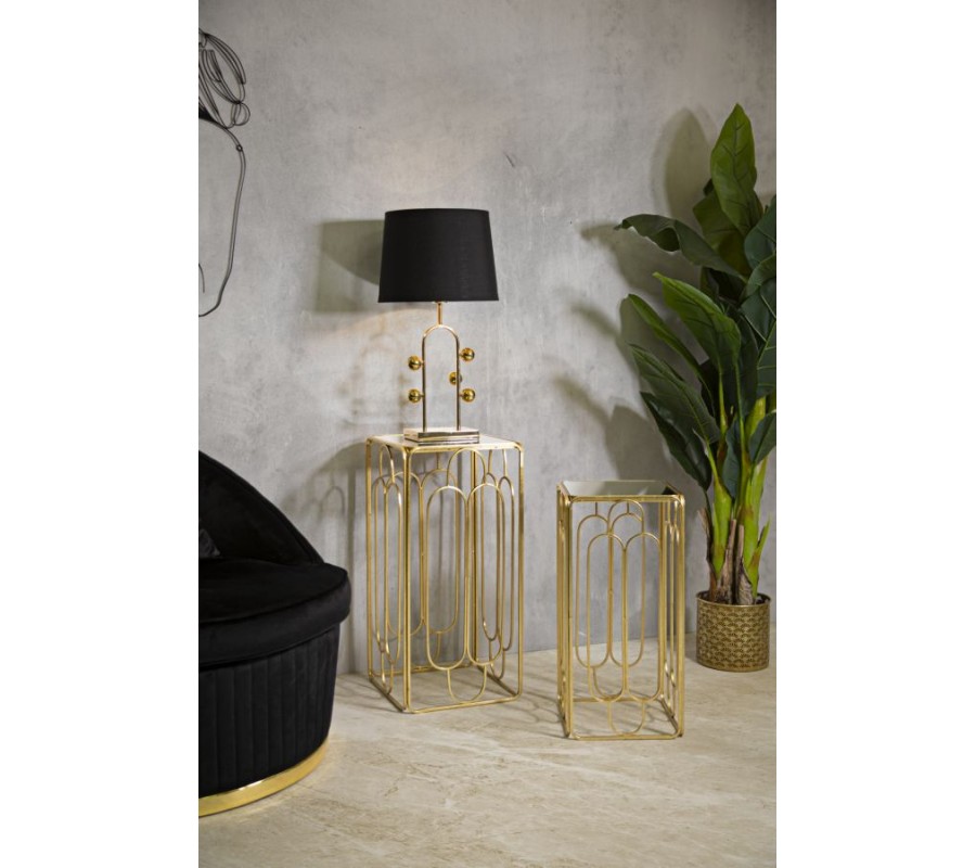 Sada príručných stolíkov Anaka v štýle art deco a glamour spája sofistikované materiály s elegantným geometrickým dizajnom. Konštrukcia stolíkov je z kovu v zlatej farbe, pričom podnož tvorí prepracovaný vzor s