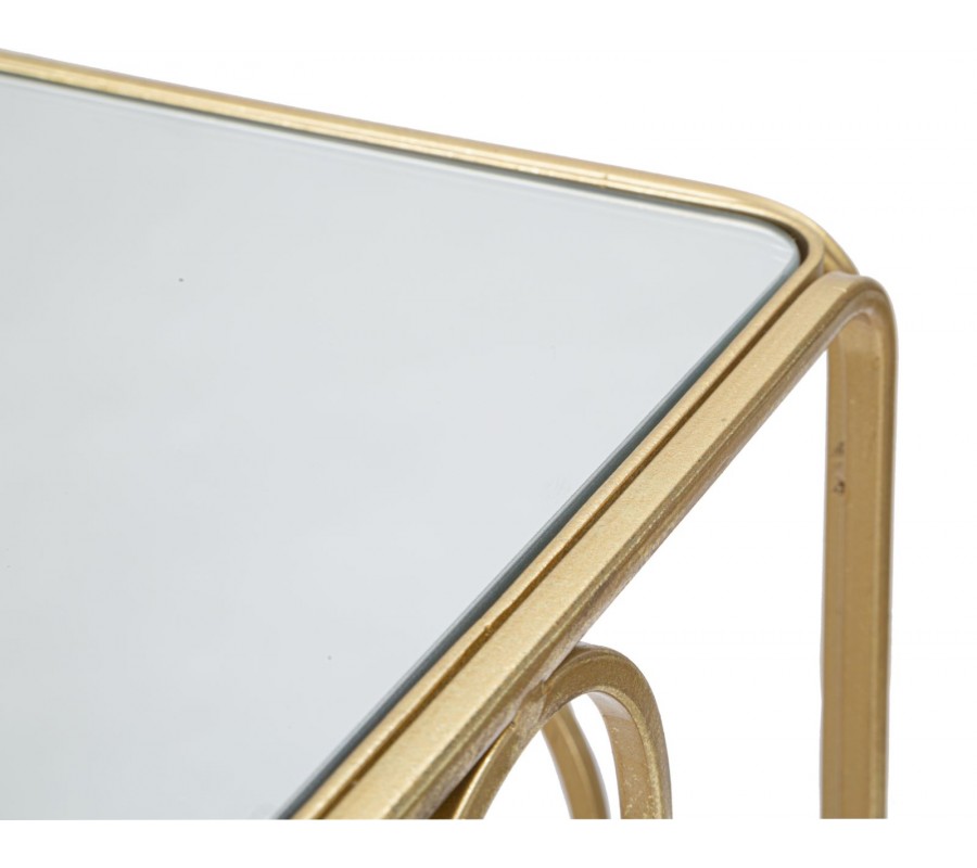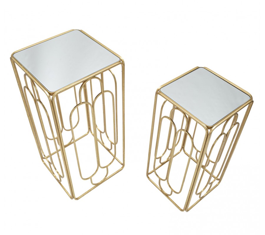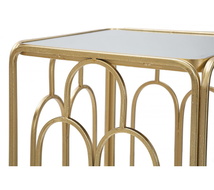 Art deco sada kovových štvorcových zlatých príručných stolíkov Anaka s geometrickými vzormi s vrchnou zrkadlovou doskou 70 cm