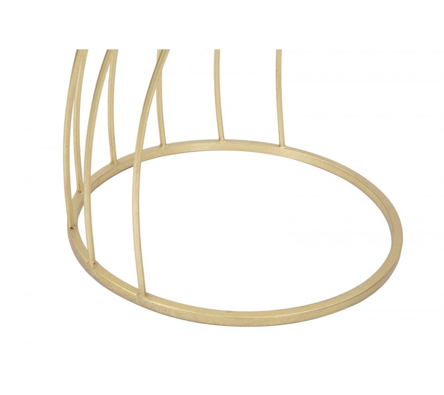Podstava stolíka je vyrobená z jemných zlatých kovových prútov, ktoré sú zvlnené a usporiadané do elegantného špirálového vzoru. Tento efekt vytvára pocit pohybu a ľahkosti, pričom stabilitu zabezpečuje okrúhla spodná spojnica, ktorá drží celú konštrukciu v rovnováhe.