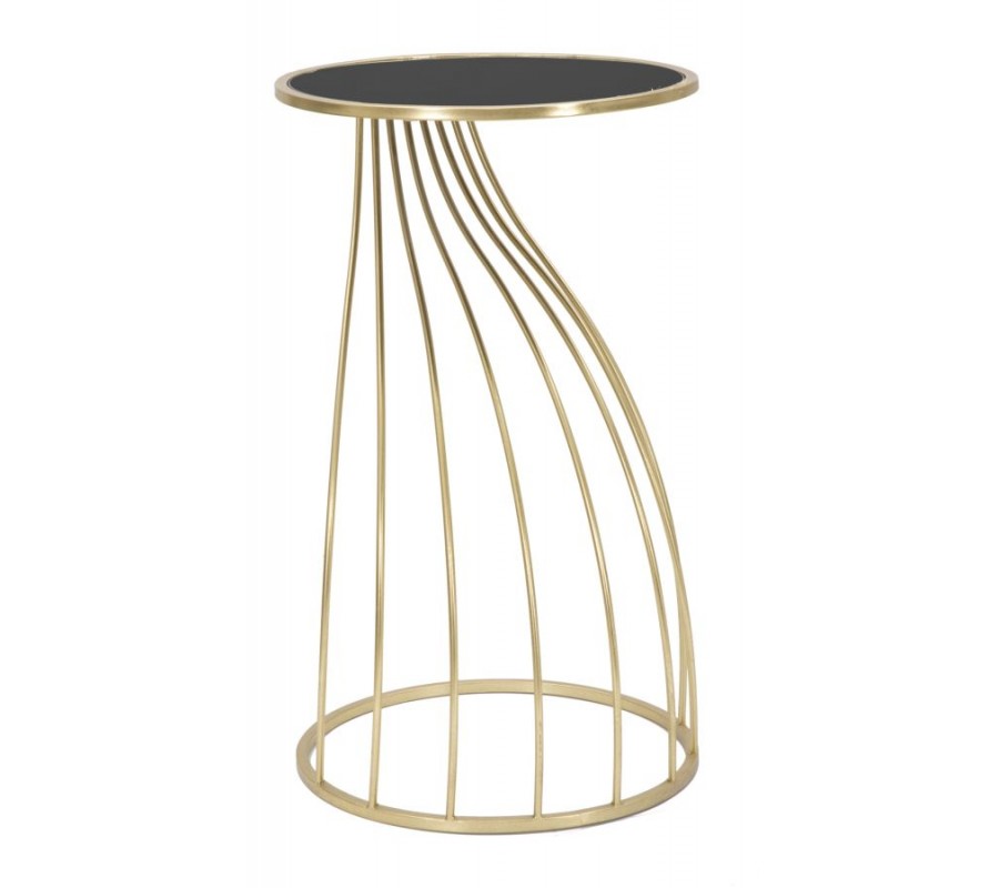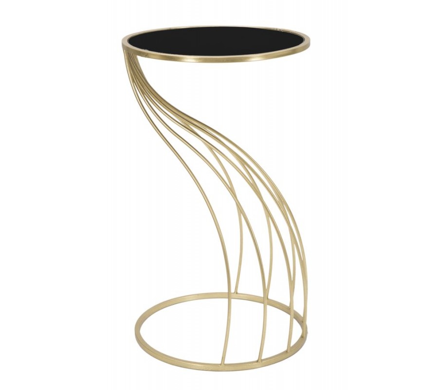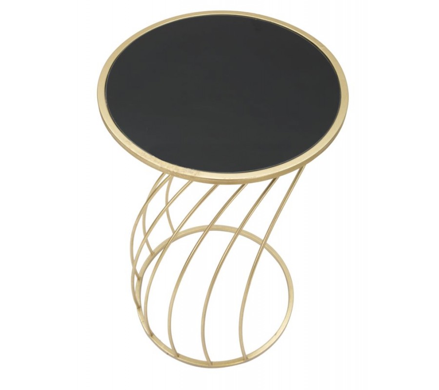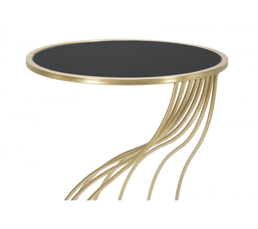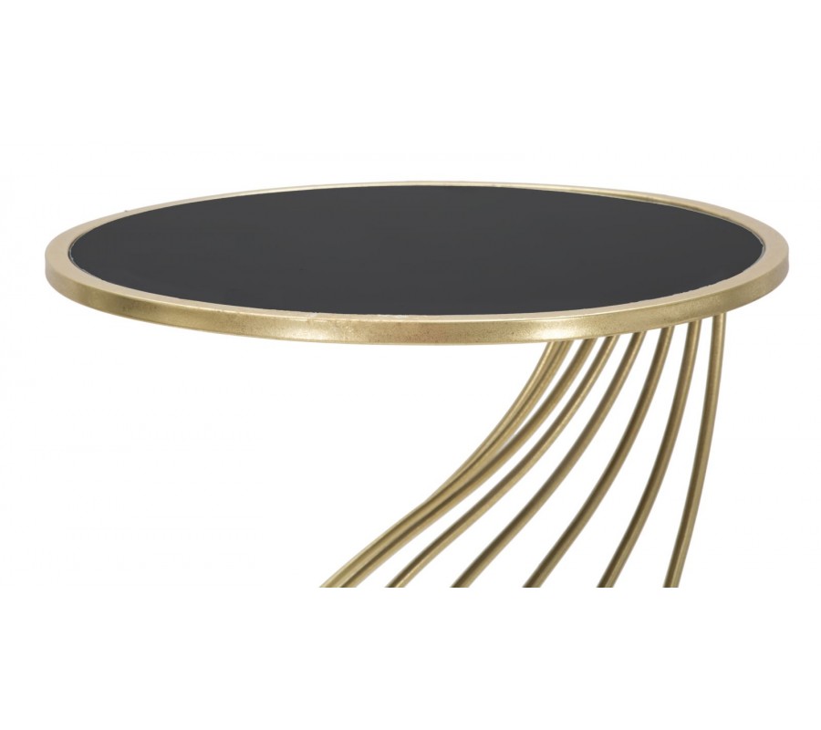 Art deco okrúhly zlatý príručný stolík Naselam s kovovými ohnutými prútmi a vrchnou čiernou sklenenou doskou 73 cm